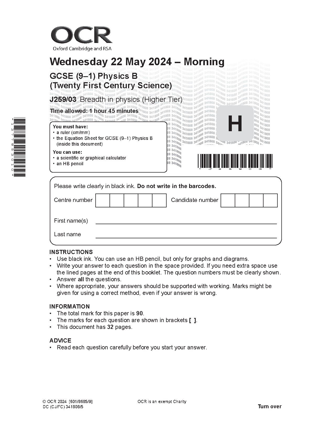 2024 OCR GCSE Physics B Paper 3 (J259/03: Breadth in physics (Higher Tier))