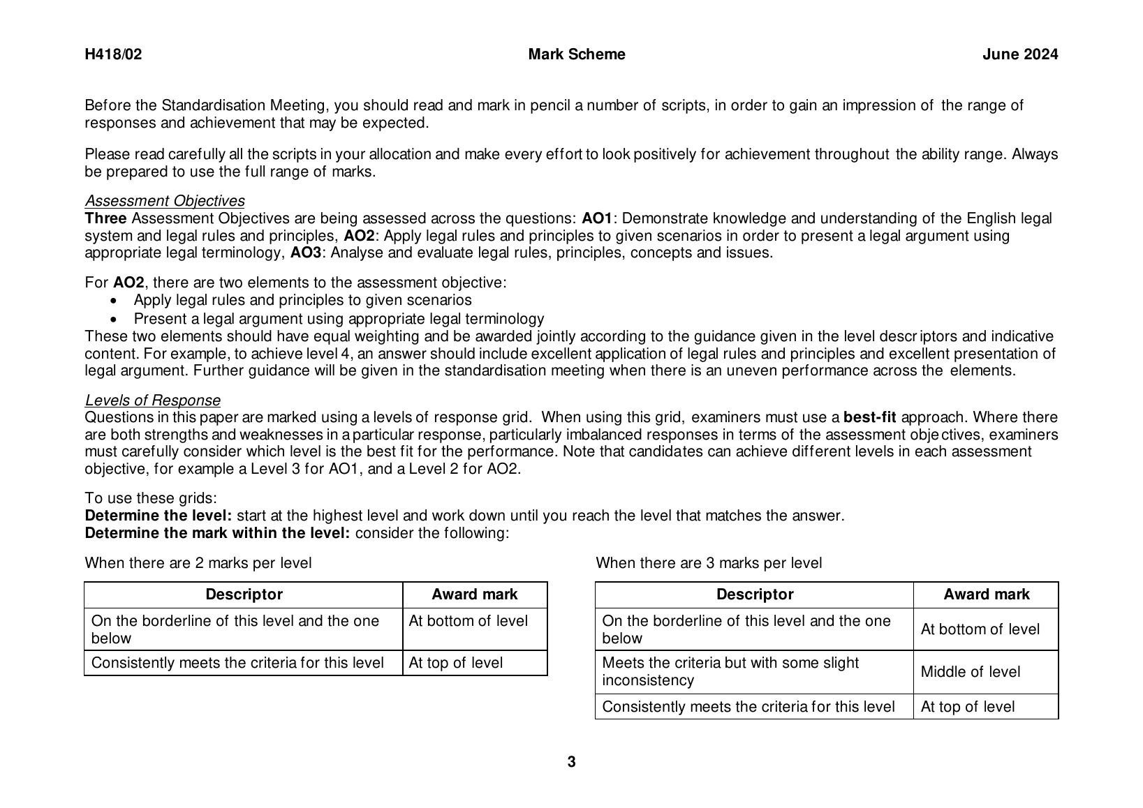 OCR GCE LAW A LEVEL PAPER 2 MARK SCHEME 2024(H418/02:LAW MAKING AND THE LAW OF TORT)