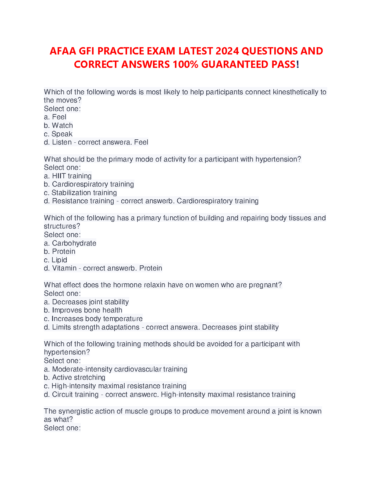 Ace your AFAA GFI exam on the first attempt with our comprehensive 2024 practice exam featuring the latest questions and 100% guaranteed correct answers. This resource is designed to help you avoid resits and achieve exam success. Prepare effectively for your AFAA Group Fitness Instructor certification!