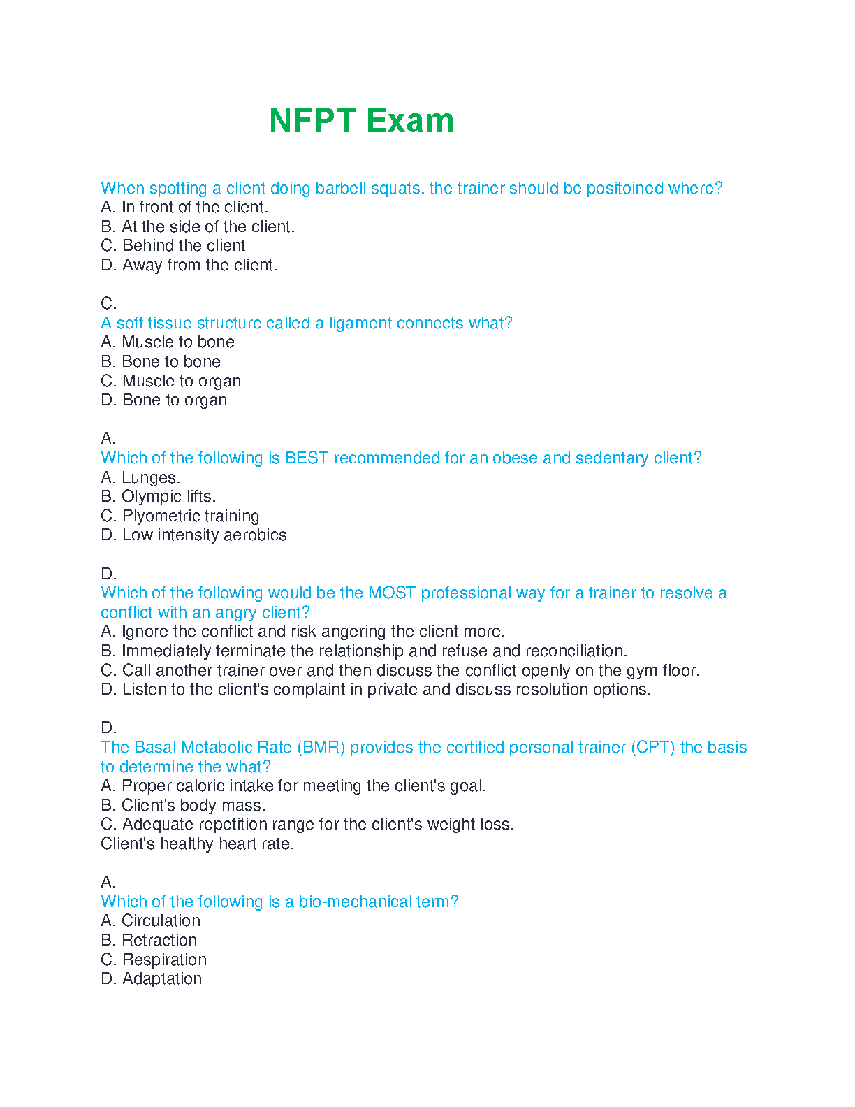 Prepare for the NFPT exam with this comprehensive set of practice questions. Designed to help you pass your certification exam on the first attempt and avoid resits, these questions cover key concepts in fitness and personal training, ensuring you're fully prepared for exam day. Boost your confidence and master the material with this essential study resource.