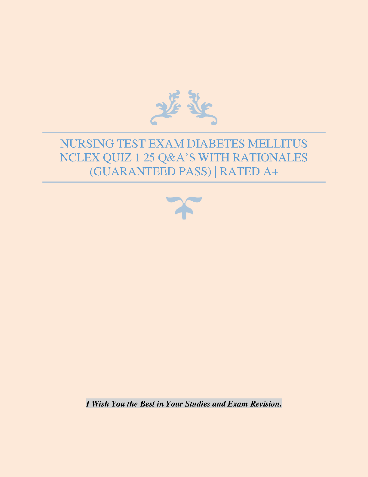 Ace your NCLEX-RN exam with this comprehensive 25-question quiz on Diabetes Mellitus. Each question includes detailed rationales to ensure a thorough understanding of the material. This resource is designed to help you pass your exam on the first attempt. Perfect for 2024/2025 nursing students.