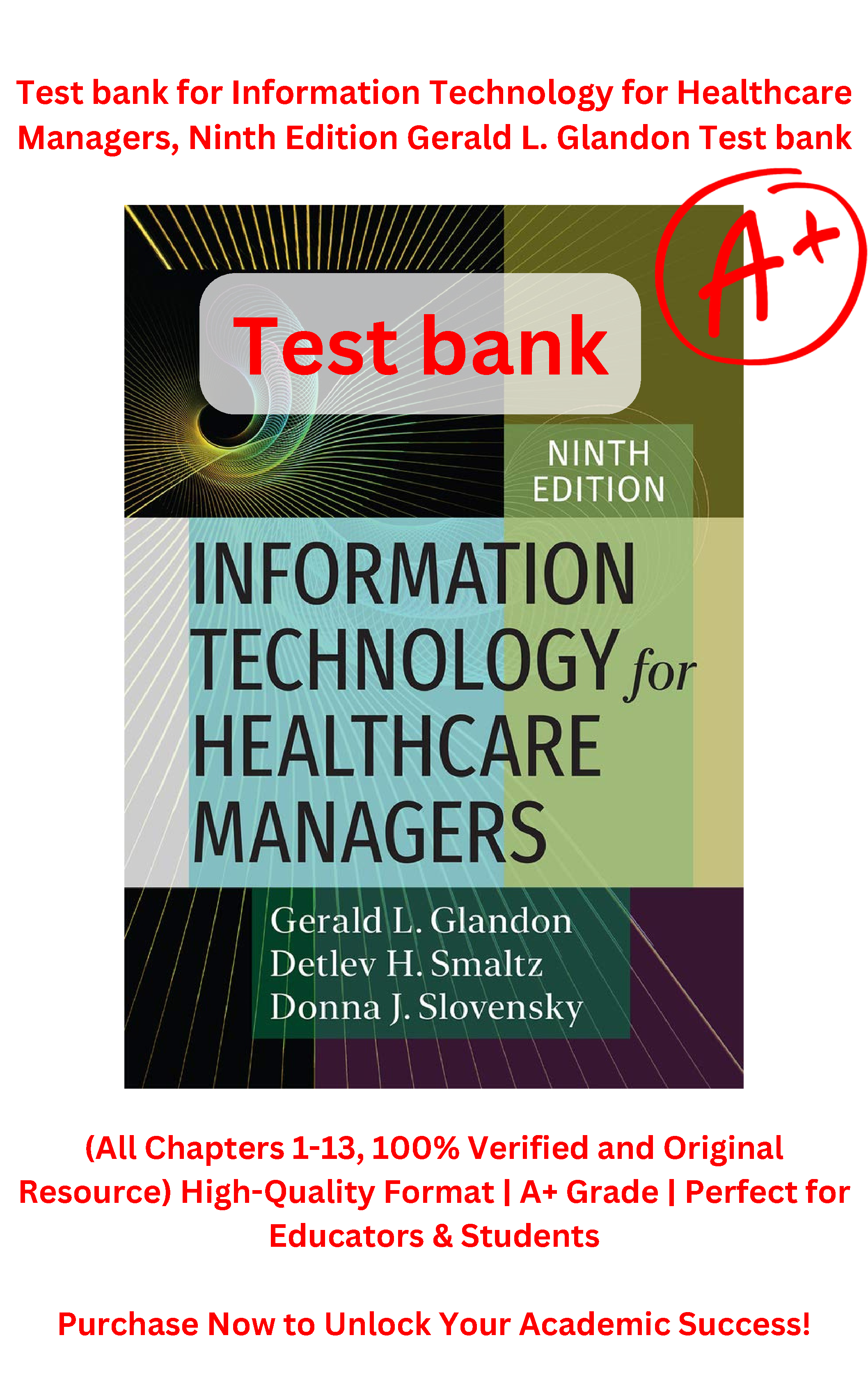 Ace your exams with this comprehensive test bank for Information Technology for Healthcare Managers, Ninth Edition by Gerald L. Glandon, Detlev H. Smaltz, and Donna J. Slovensky. This high-quality resource covers all chapters (1-13) and is perfect for students and educators seeking to achieve top grades. 100% verified and original content guarantees a superior learning experience. Avoid resits and unlock your academic success!