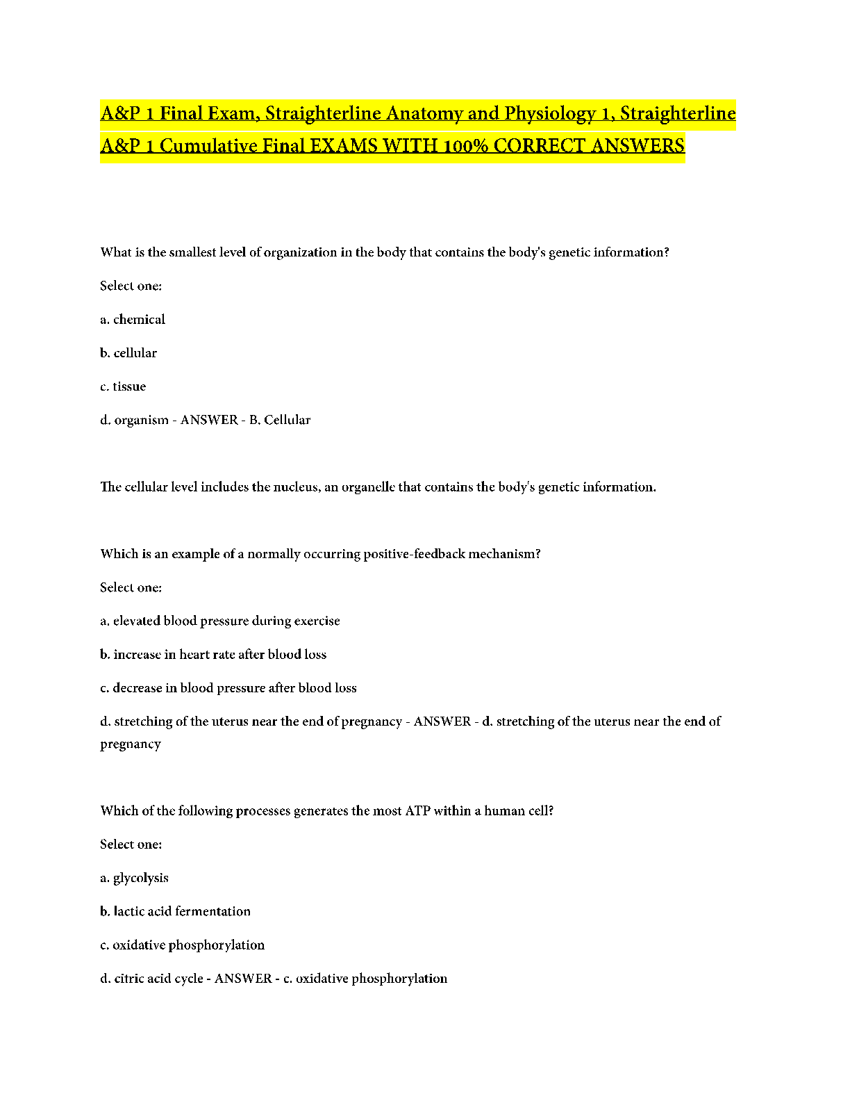 Ace your Straighterline Anatomy and Physiology 1 final exam with this comprehensive resource. This study guide contains 100% correct answers to the cumulative final exams, ensuring you pass on your first attempt and avoid resits. Prepare effectively and confidently for your exam.