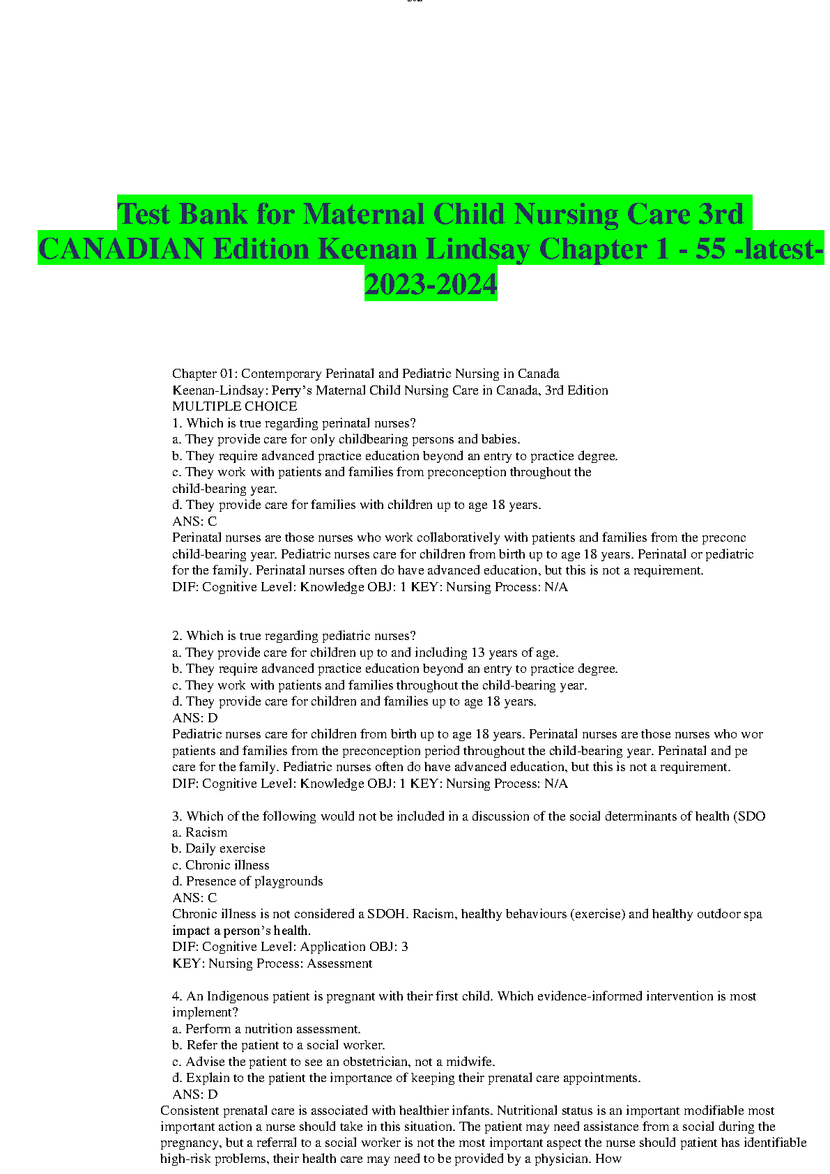 This comprehensive test bank for Keenan Lindsay's Maternal Child Nursing Care, 3rd Canadian Edition, provides a wealth of practice questions to help students master the material and excel on their exams. Prepare thoroughly and confidently for success, avoiding resits with this invaluable resource for the 2024-2025 academic year.