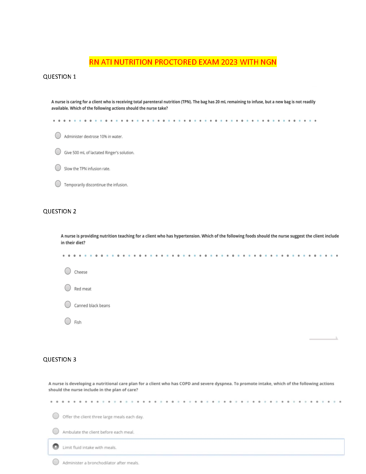 Prepare for your ATI Nutrition Proctored Exam with confidence! This resource features practice questions covering key concepts in nutrition for RNs. Master total parenteral nutrition (TPN) management, nutritional needs for hypertension, and dietary considerations for COPD patients. Ace your exam on the first try and avoid resits.