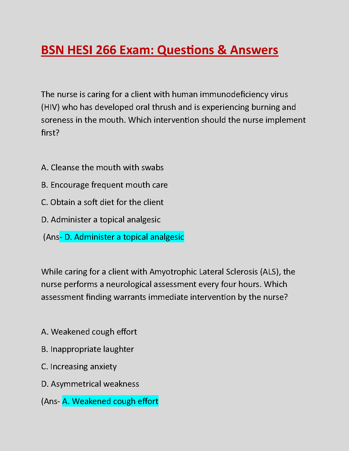 BSN HESI 266 Exam: Questions & Answers - 2024/2025 Edition