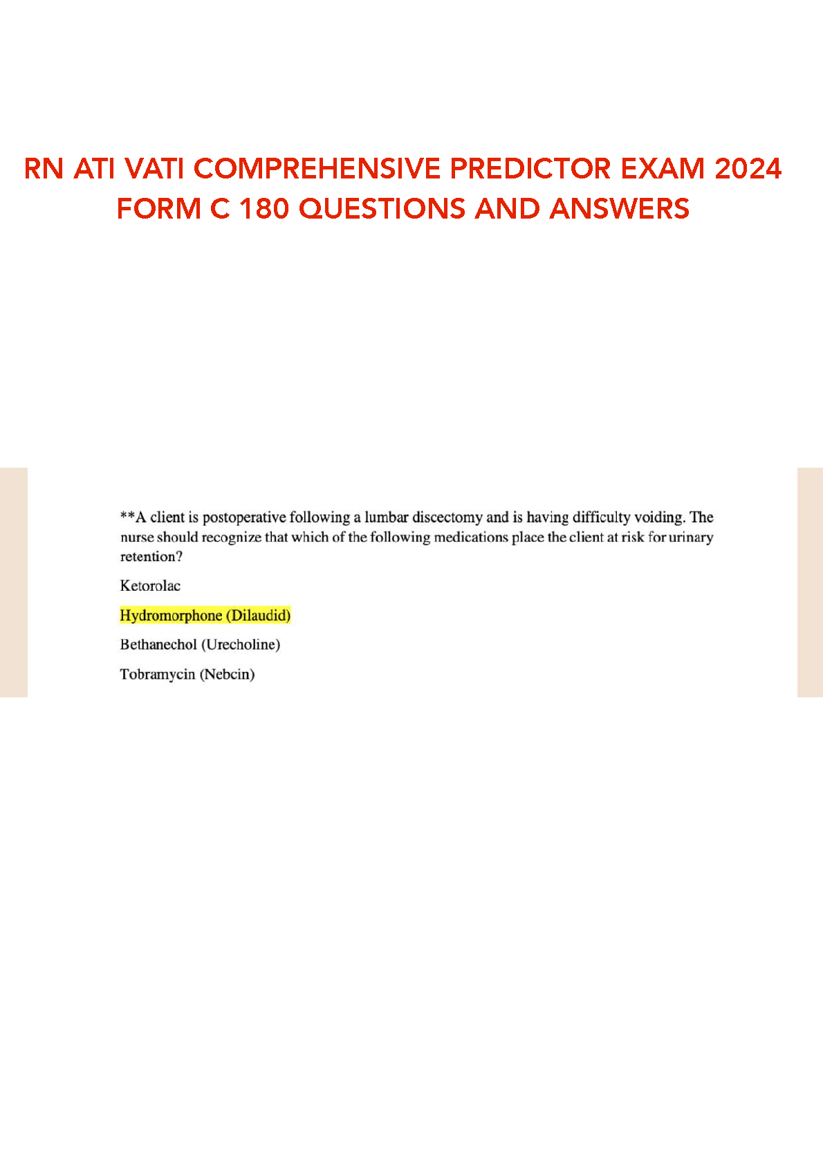 RN ATI VATI Comprehensive Predictor Exam 2024 Form C: 180 Questions and Answers