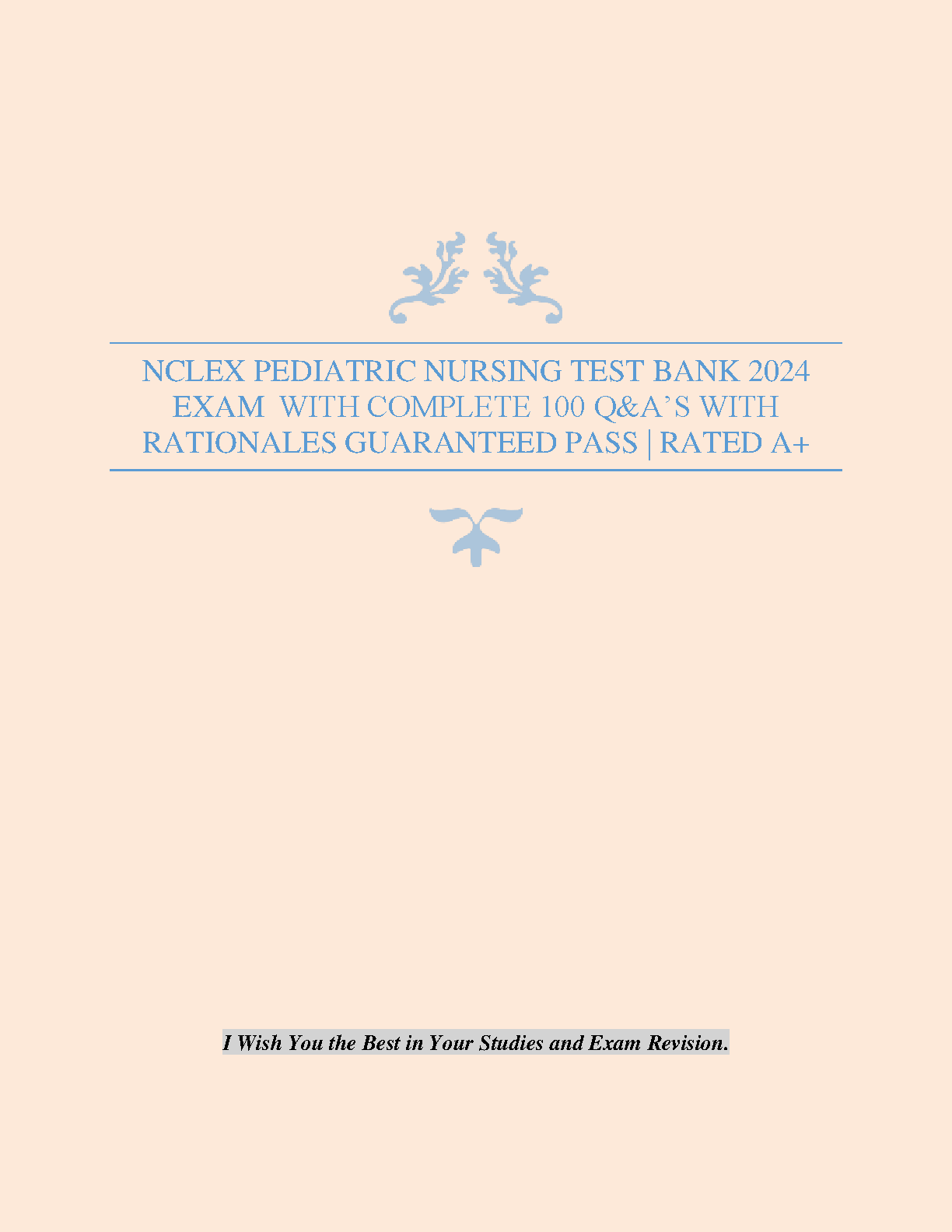 Ace your NCLEX-RN Pediatric Nursing exam with this comprehensive 2024 test bank! Featuring 100 detailed questions with rationales, this resource is designed to...