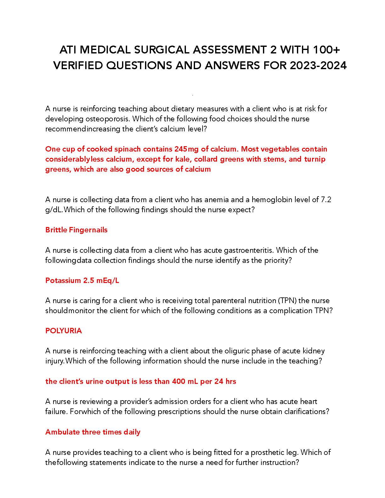 Ace your ATI Medical Surgical Assessment 2 exam on the first try with this comprehensive study guide. Featuring over 100 verified questions and answers, this resource is designed to help you master key concepts and avoid resits. Prepare effectively for the 2024-2025 academic year.