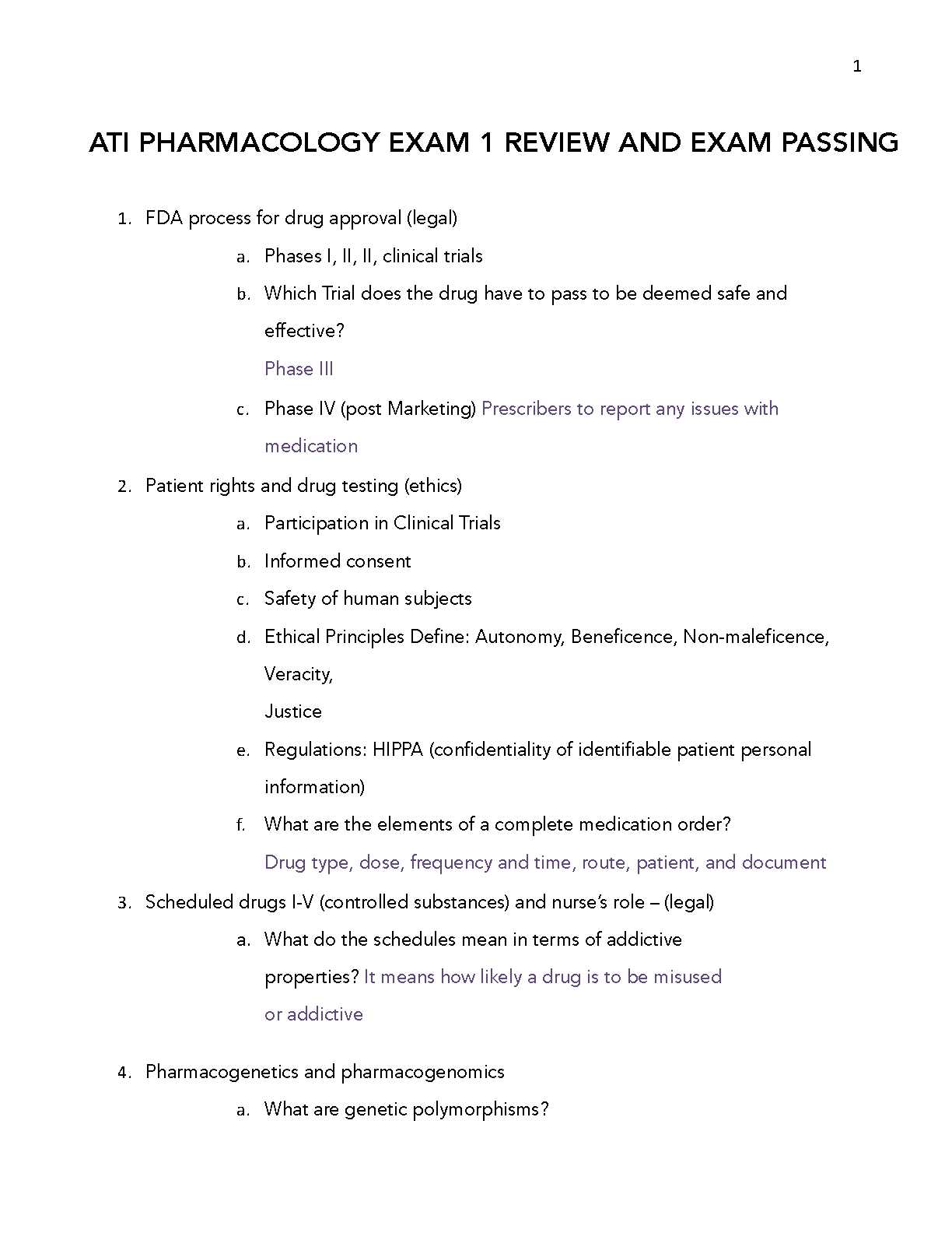 Conquer your ATI Pharmacology Exam 1 with this comprehensive 2024/2025 study guide. Designed to help students pass their exams on the first try and avoid resits, this resource covers key topics including FDA drug approval processes, patient rights, ethical considerations in drug testing, scheduled drugs, and pharmacogenetics. Master the material and boost your confidence for exam day!