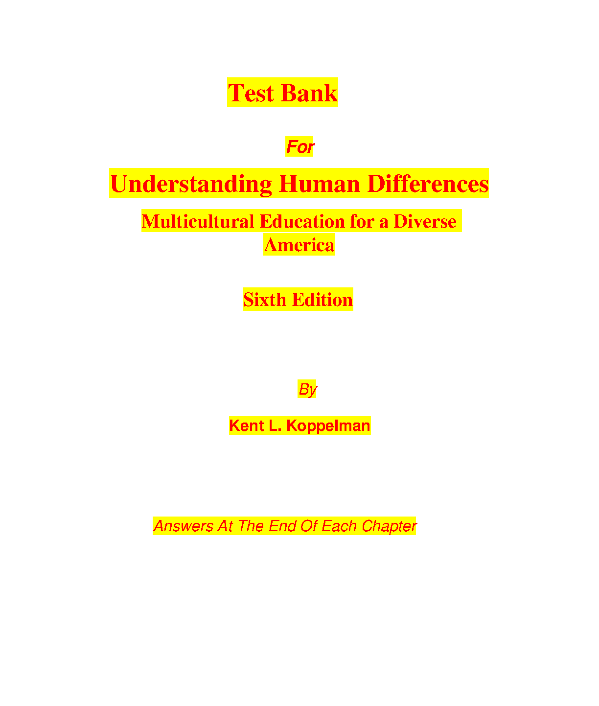Test Bank for Understanding Human Differences: Multicultural Education for a Diverse America, Sixth Edition by Kent L. Koppelman
