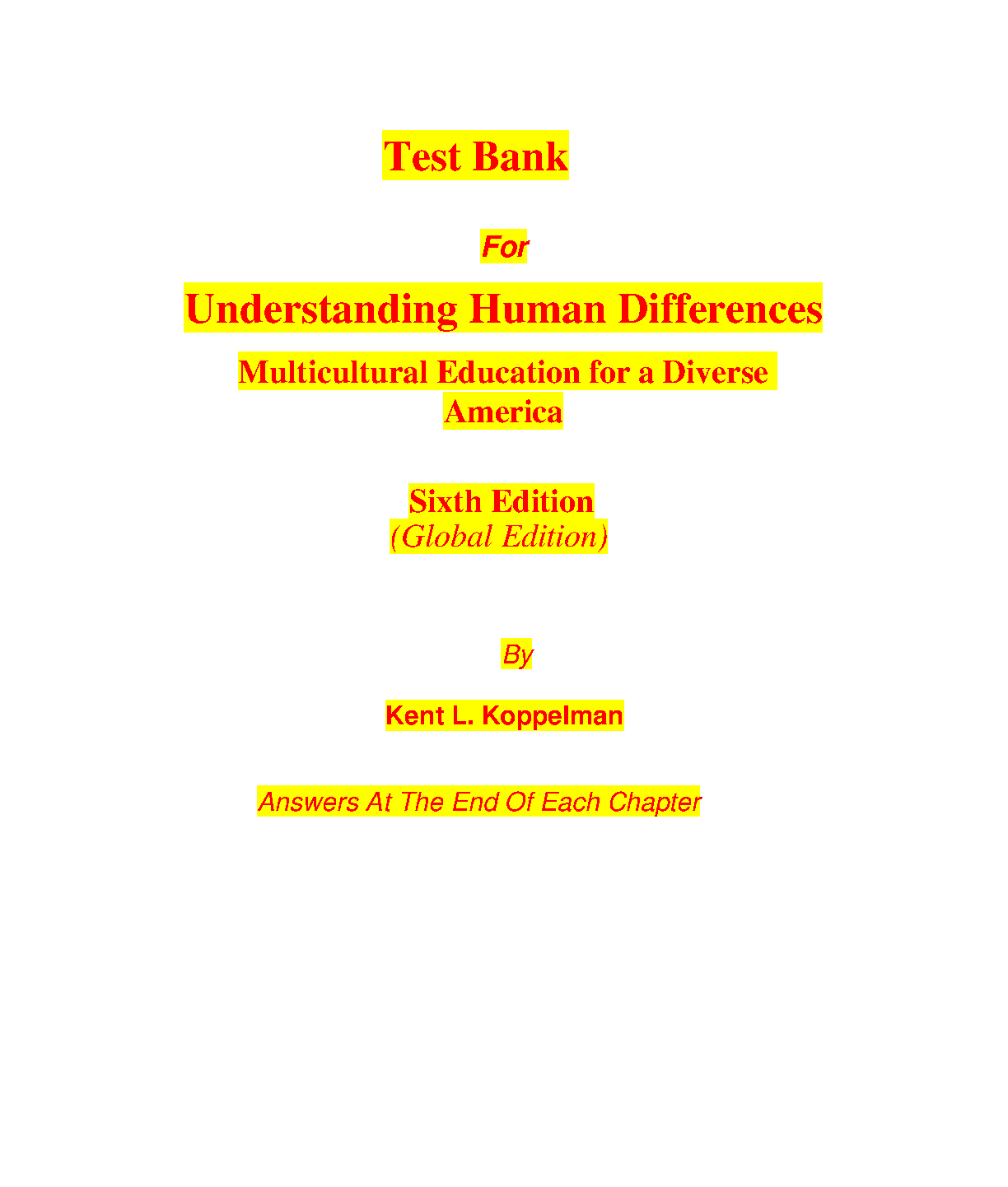Test Bank for Understanding Human Differences: Multicultural Education for a Diverse America, 6th Edition (Global Edition) by Kent L. Koppelman
