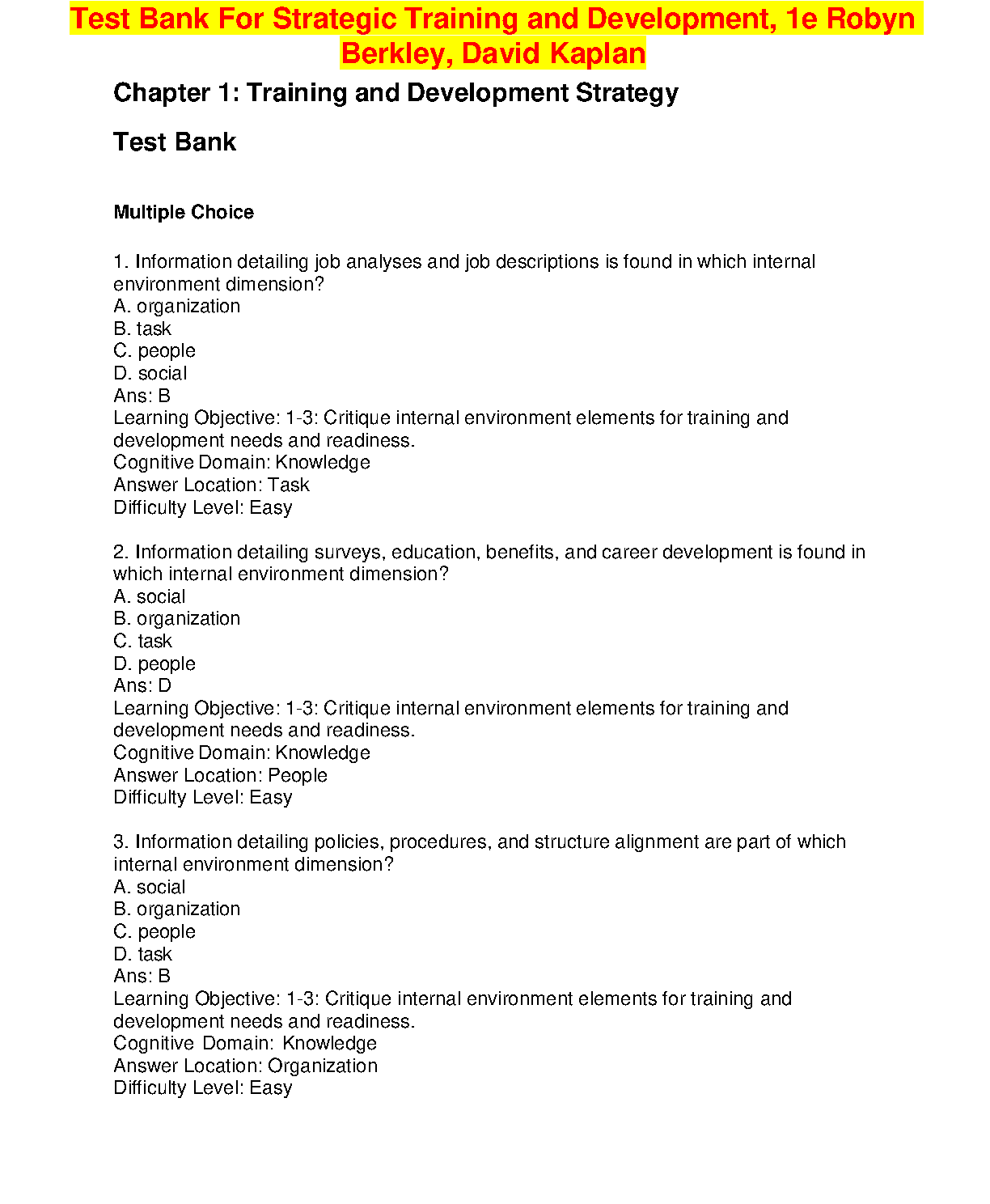 Test Bank for Strategic Training and Development, 1st Edition by Robyn Berkley and David Kaplan
