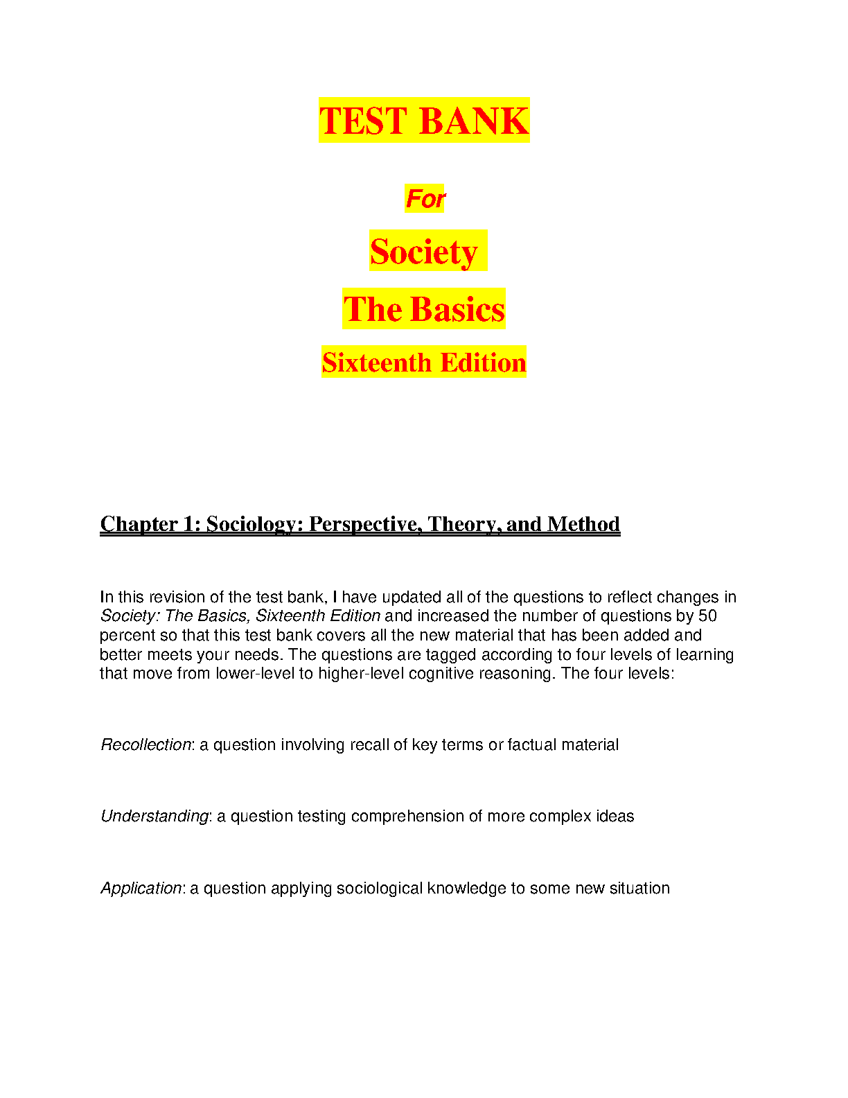 Ace your Sociology exams with this comprehensive test bank for Macionis and Plummer's Society: The Basics, 16th Edition. This updated resource includes 50% more questions covering new material, categorized by four levels of cognitive reasoning for effective exam preparation. Guaranteed to help you pass on your first attempt!