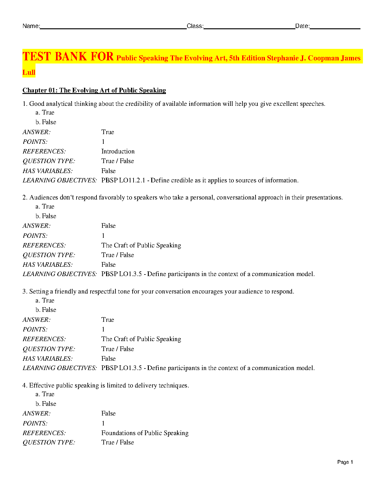 This test bank contains a comprehensive collection of True/False questions for Public Speaking: The Evolving Art, 5th Edition by Stephanie J. Coopman and James Lull. Ideal for instructors to assess student understanding of key concepts and prepare for exams. This resource is designed to help students master the material and achieve exam success on their first attempt.