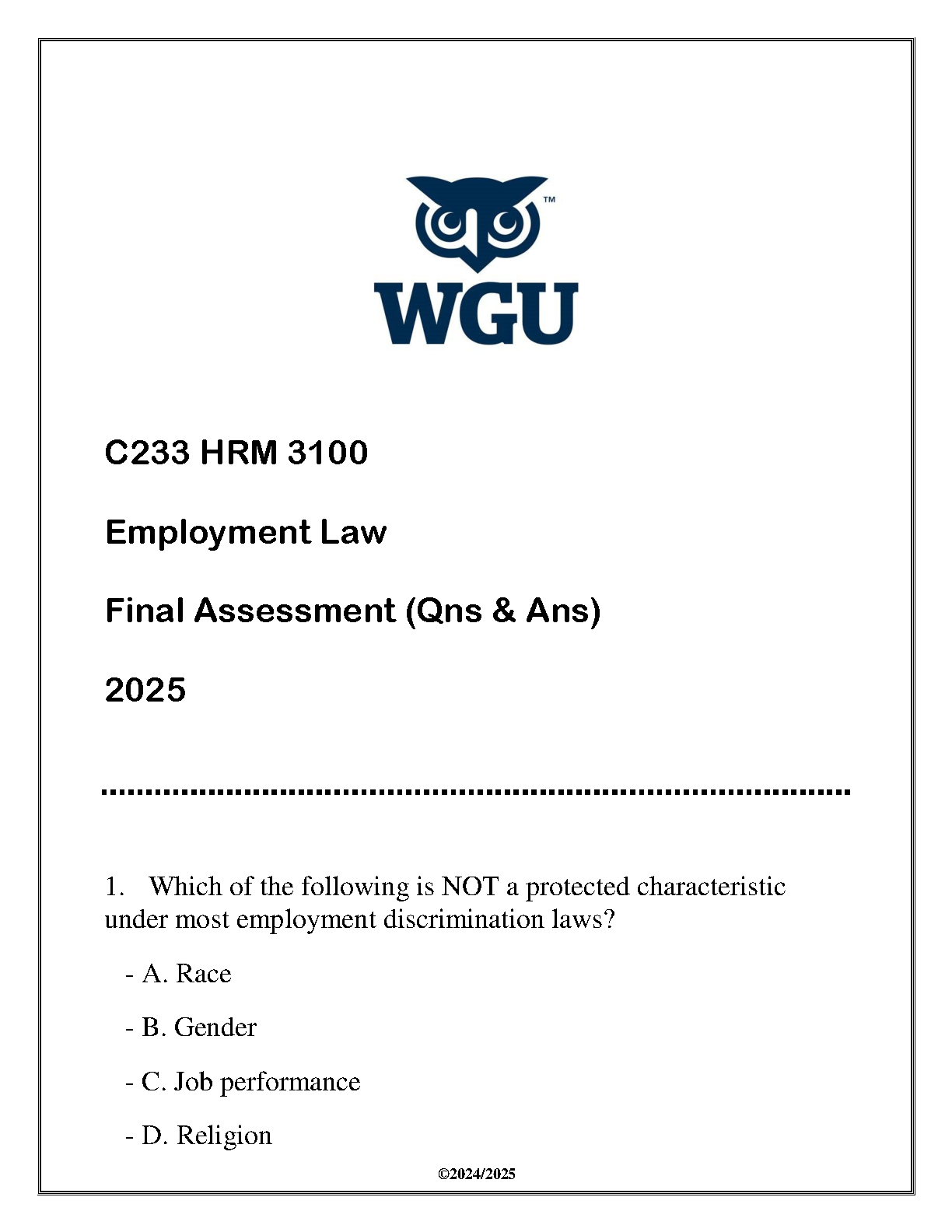 Ace your WGU C233 HRM 3100 Employment Law final exam with this comprehensive guide featuring questions and answers for the 2025 academic year. Designed to help students pass on their first attempt and avoid resits. Get ahead and master the key concepts today!