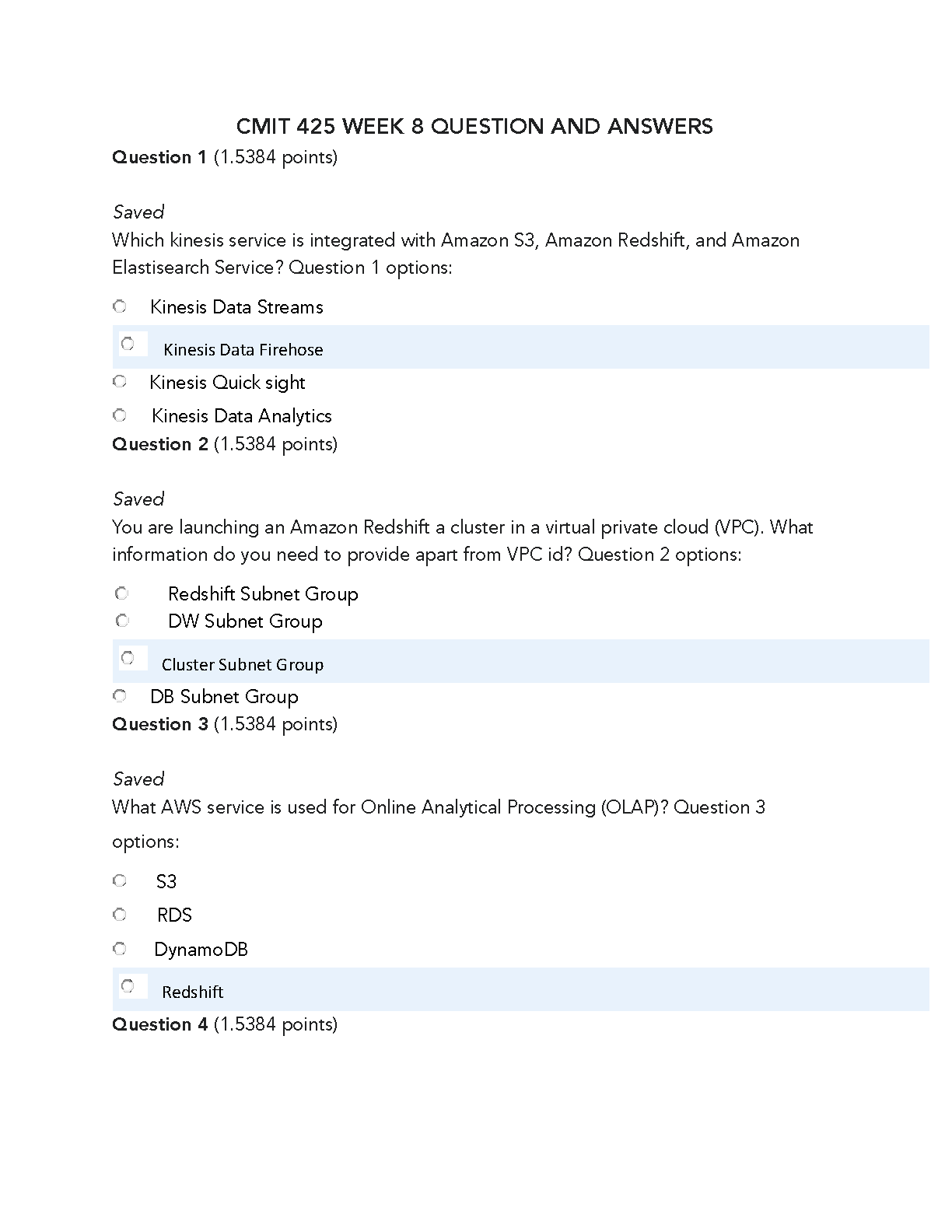 This comprehensive study guide contains questions and answers for CMIT 425 Week 8, covering key concepts to help you succeed on your exam. Master Amazon Web Services (AWS) services like Kinesis and Redshift, and confidently answer questions on VPC configurations and OLAP processing. Prepare for exam success and avoid resits with this essential resource, perfect for the 2024-2025 academic year.