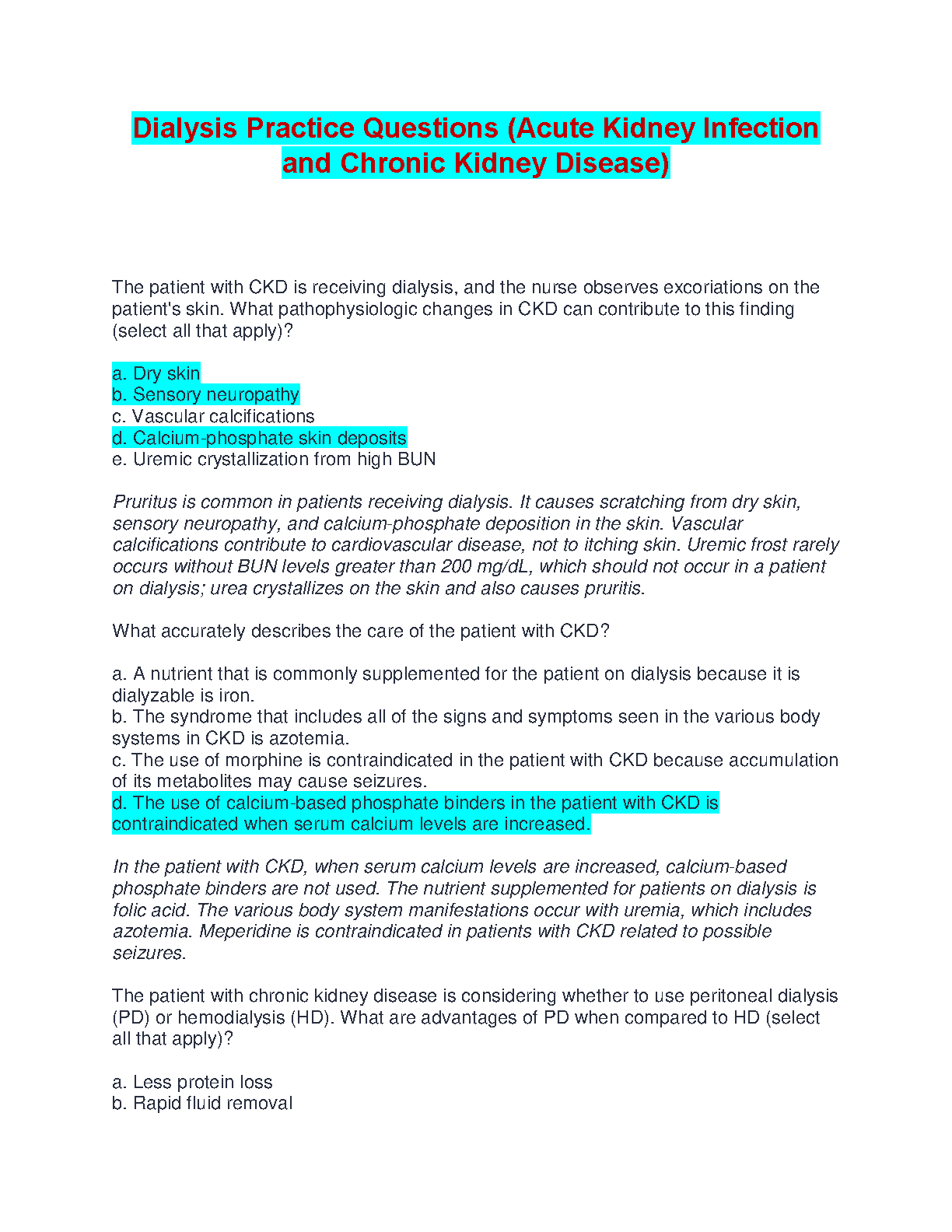 Master dialysis and chronic kidney disease with these comprehensive practice questions, designed to help nursing students pass their exams on the first attempt. These questions cover key pathophysiologic changes, treatment considerations, and comparisons of dialysis methods. Prepare for success and avoid resits!