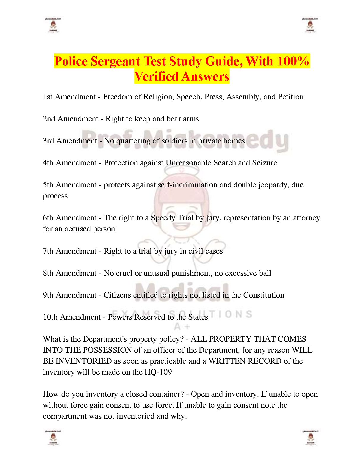 Conquer your Police Sergeant exam with this comprehensive study guide. This resource covers key concepts including constitutional amendments and department property policies, providing verified answers to help you pass on your first attempt. Get exam-ready and avoid resits!