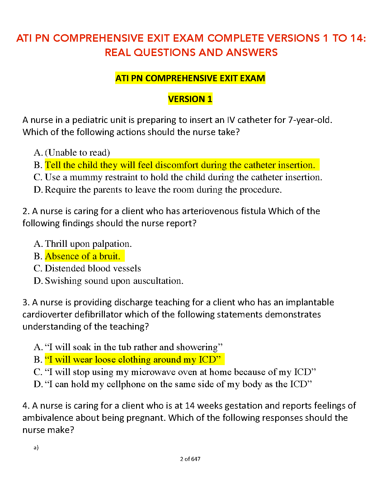 Ace your ATI PN Comprehensive Exit Exam on your first attempt with this comprehensive study guide. This 2024-2025 edition contains real questions and answers from versions 1 to 14, ensuring you're fully prepared for exam day. Avoid resits and boost your confidence with this essential resource.