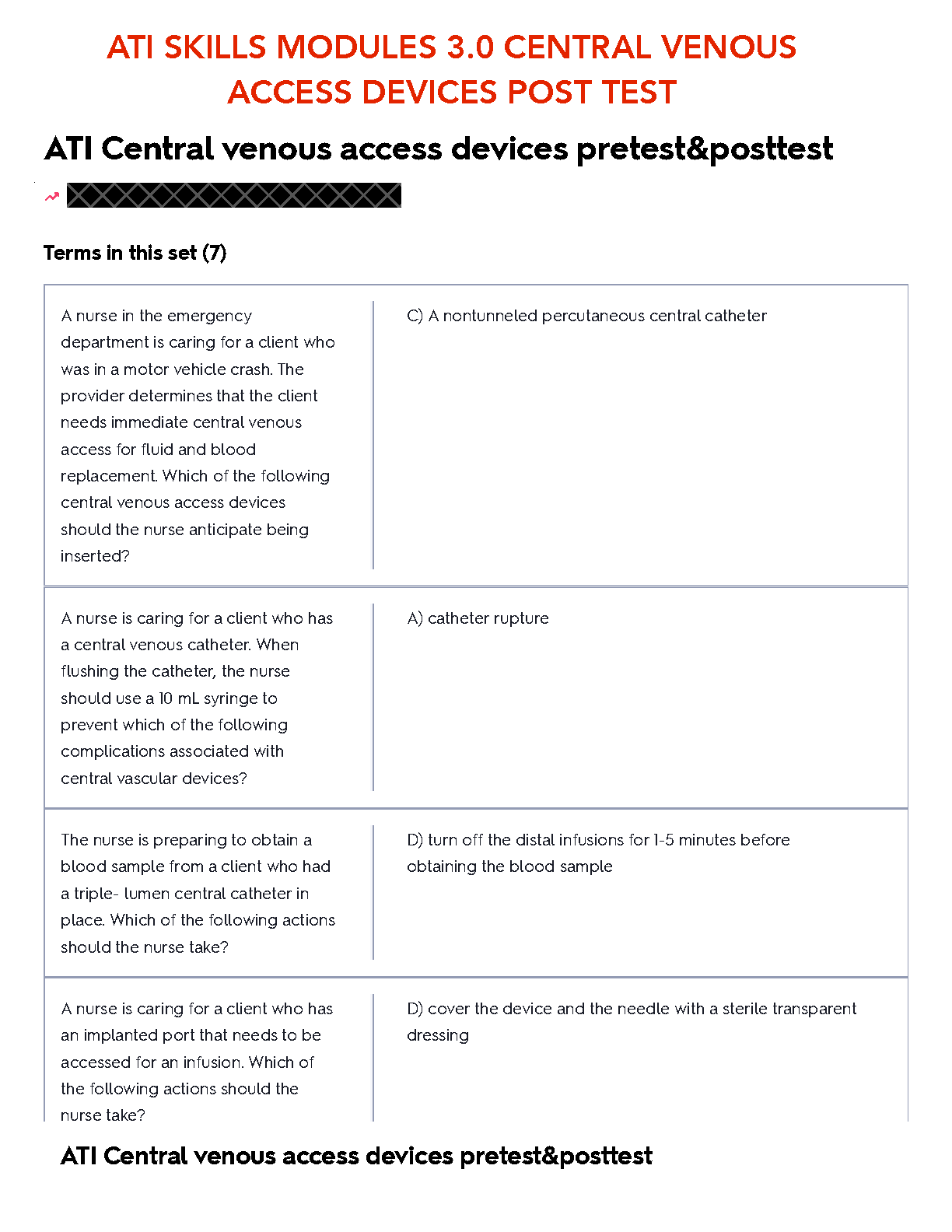 ATI Skills Modules 3.0 Central Venous Access Devices: Pretest & Posttest - Exam Prep for 2024-2025