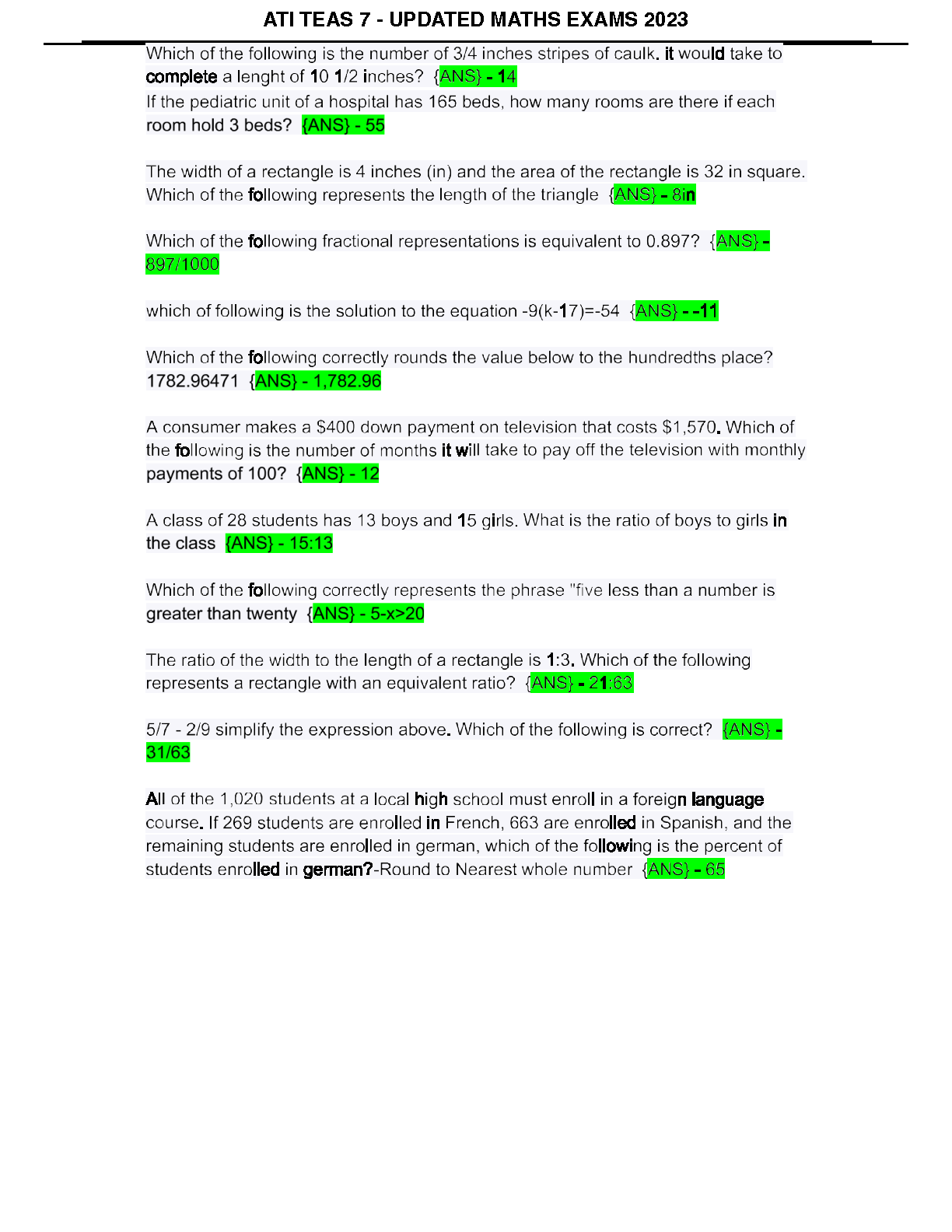 ATI TEAS 7 - Updated Maths Exams 2023: Complete Practice Questions and Answers