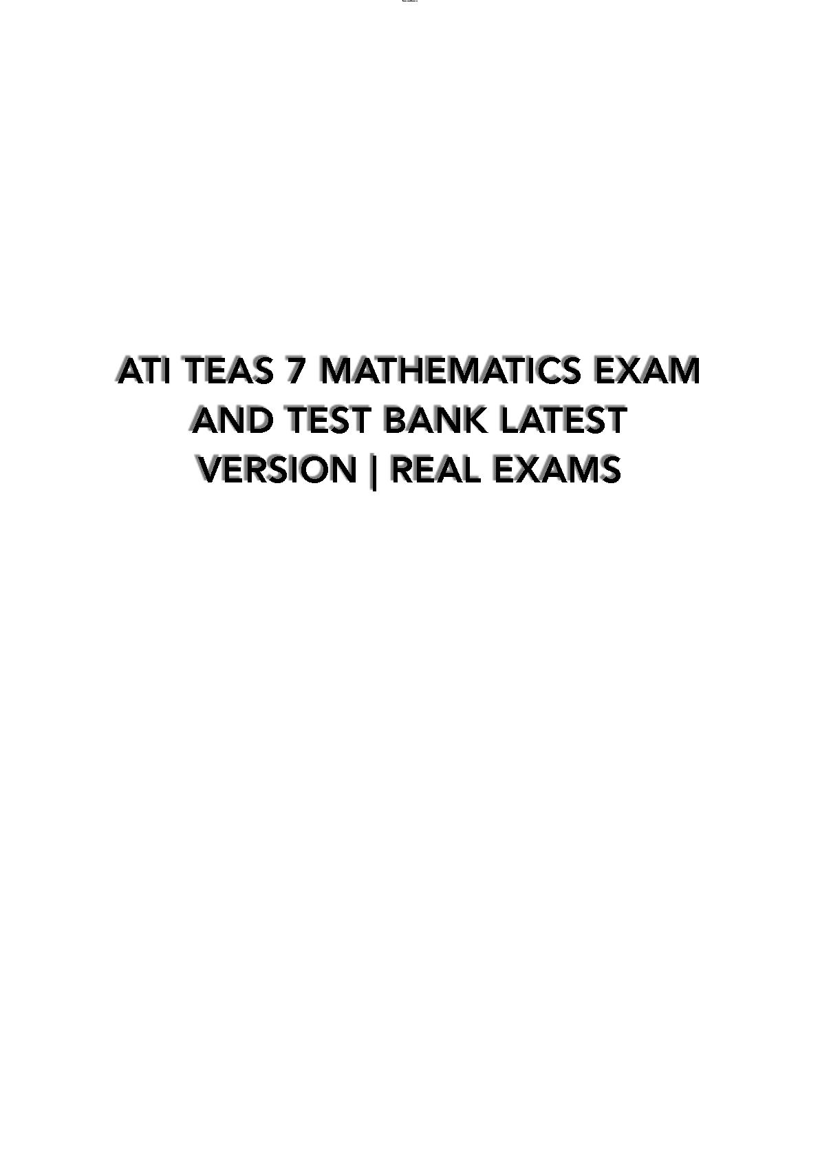 Ace your ATI TEAS 7 Mathematics exam with this comprehensive test bank! This resource contains the latest version of the exam and provides in-depth explanations to help you avoid resits and pass on your first attempt. Ideal for students preparing for the 2024-2025 academic year.