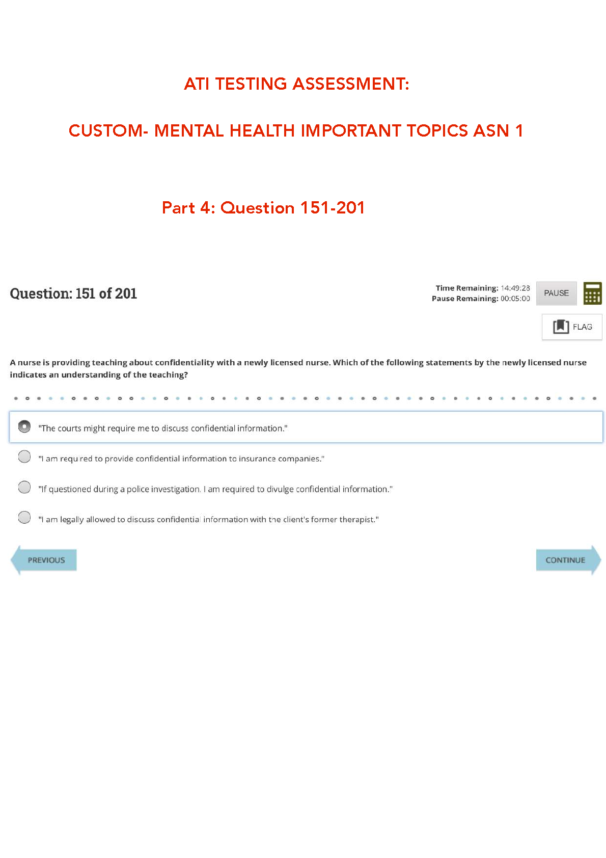 ATI Testing Assessment: Custom - Mental Health Important Topics ASN 1 - 2024/2025 Edition