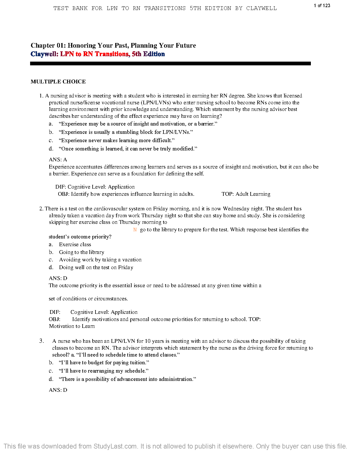 Master the content of Claywell's LPN to RN Transitions, 5th Edition, with this comprehensive test bank. Designed to help students excel on their first attempt, this resource covers key concepts and prepares you for exam success. Avoid resits and boost your confidence with this invaluable study tool.