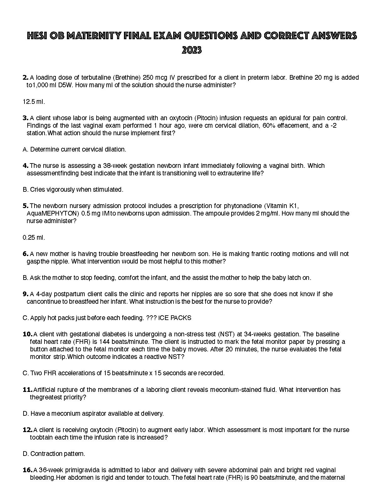 HESI OB Maternity Final Exam Questions and Correct Answers 2023 Edition by [Author Names]