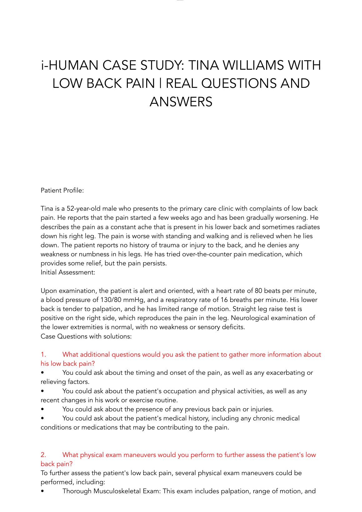 This i-Human case study presents a detailed scenario of Tina Williams, a 52-year-old male experiencing low back pain. The resource provides real-world questions and answers to help students master the assessment and management of low back pain. Perfect for acing your exams on the first attempt!