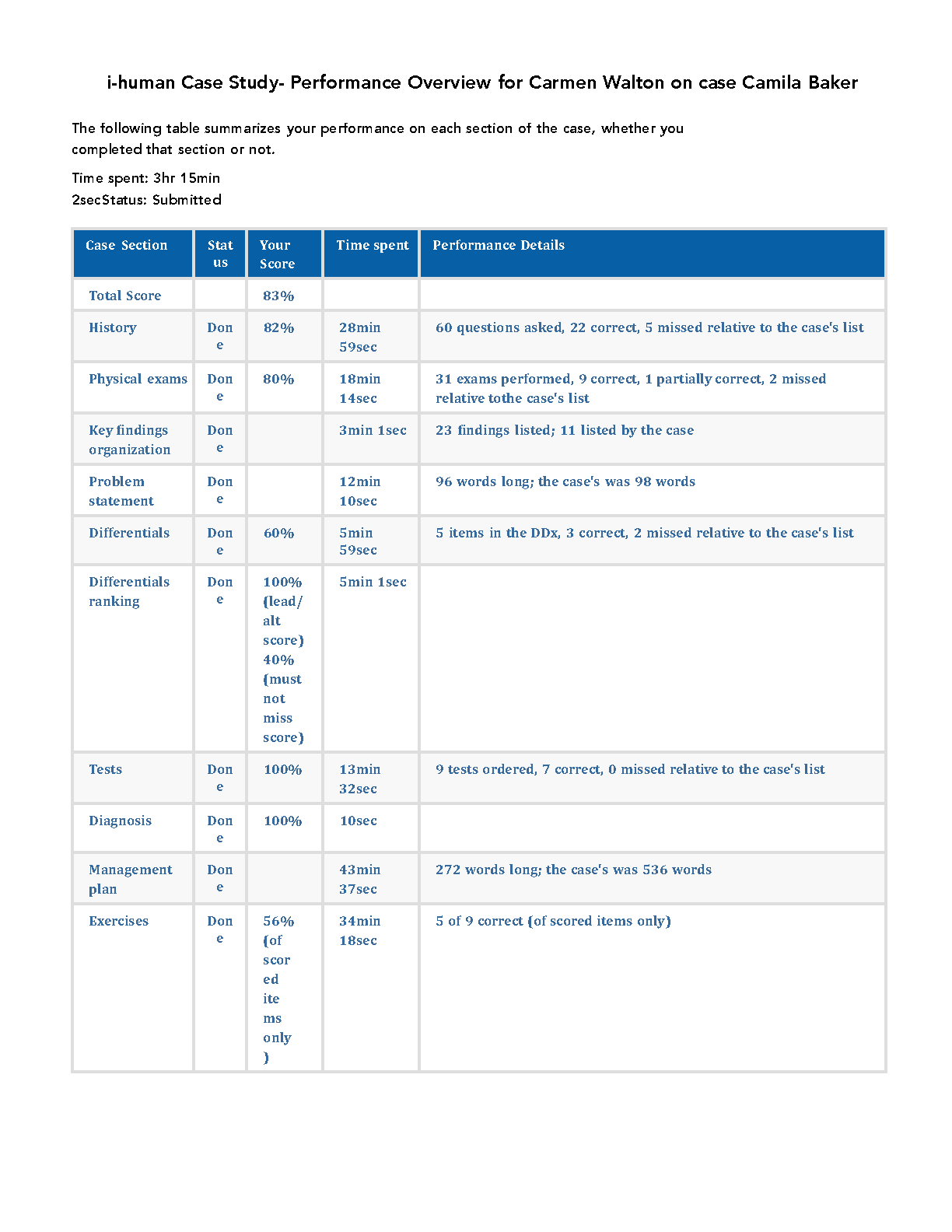 i-human Case Study Performance Overview for Carmen Walton on Camila Baker Case