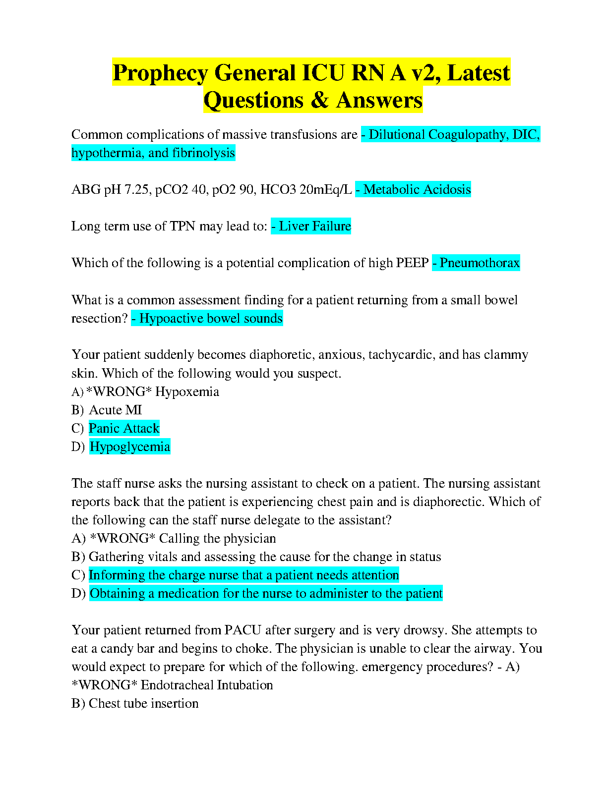 Ace your Prophecy General ICU RN A v2 exam with this comprehensive guide. This resource features the latest questions and answers, designed to help you master the material and avoid resits. Prepare effectively for success in 2024-2025!