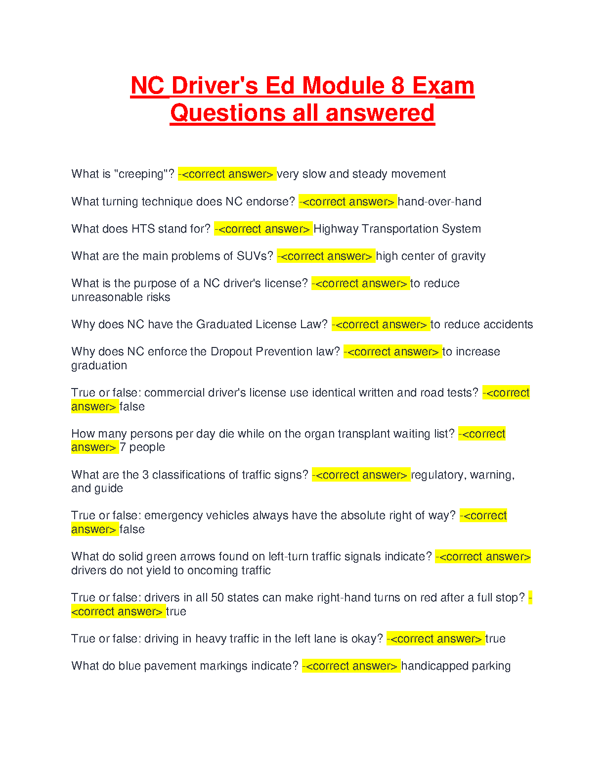 NC Driver's Ed Module 8 Exam Questions & Answers 2024/2025: Pass Your Exam on the First Attempt