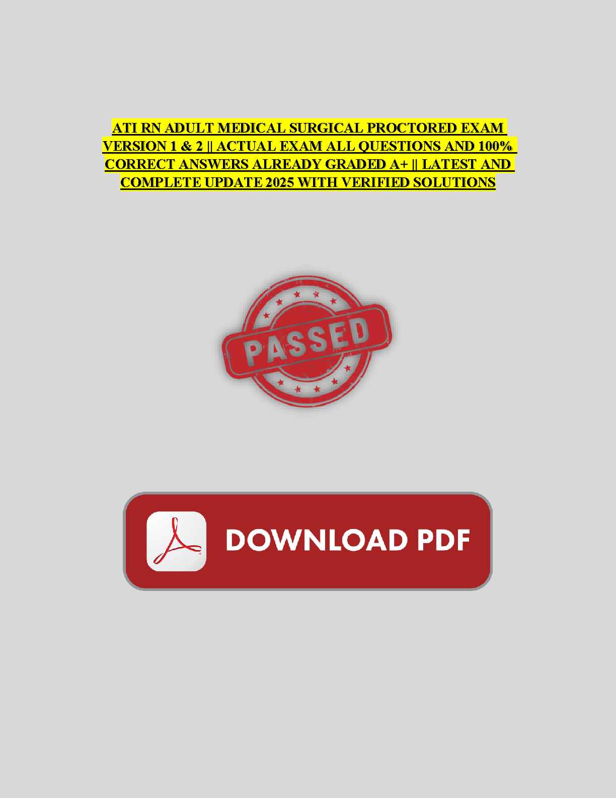 Ace your ATI RN Adult Medical Surgical Proctored Exam with this comprehensive study guide. This resource includes all questions and 100% correct answers from versions 1 and 2, ensuring a perfect score and avoiding exam resits. Get the latest updates for the 2025 academic year and pass your exam on the first try!