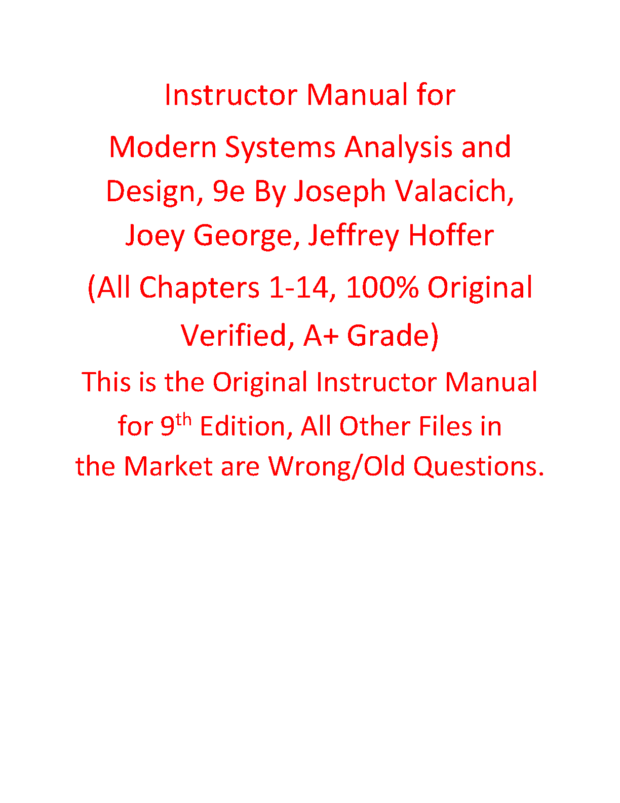 Unlock the secrets to success with this original and verified instructor manual for Modern Systems Analysis and Design, 9th edition, by Joseph Valacich, Joey George, and Jeffrey Hoffer. This comprehensive resource covers all chapters (1-14) with 100% accurate and up-to-date questions, helping you achieve an A+ grade and pass your exams on the first try! Unlike other outdated materials, this manual provides the most current information for your academic year (2024/2025).