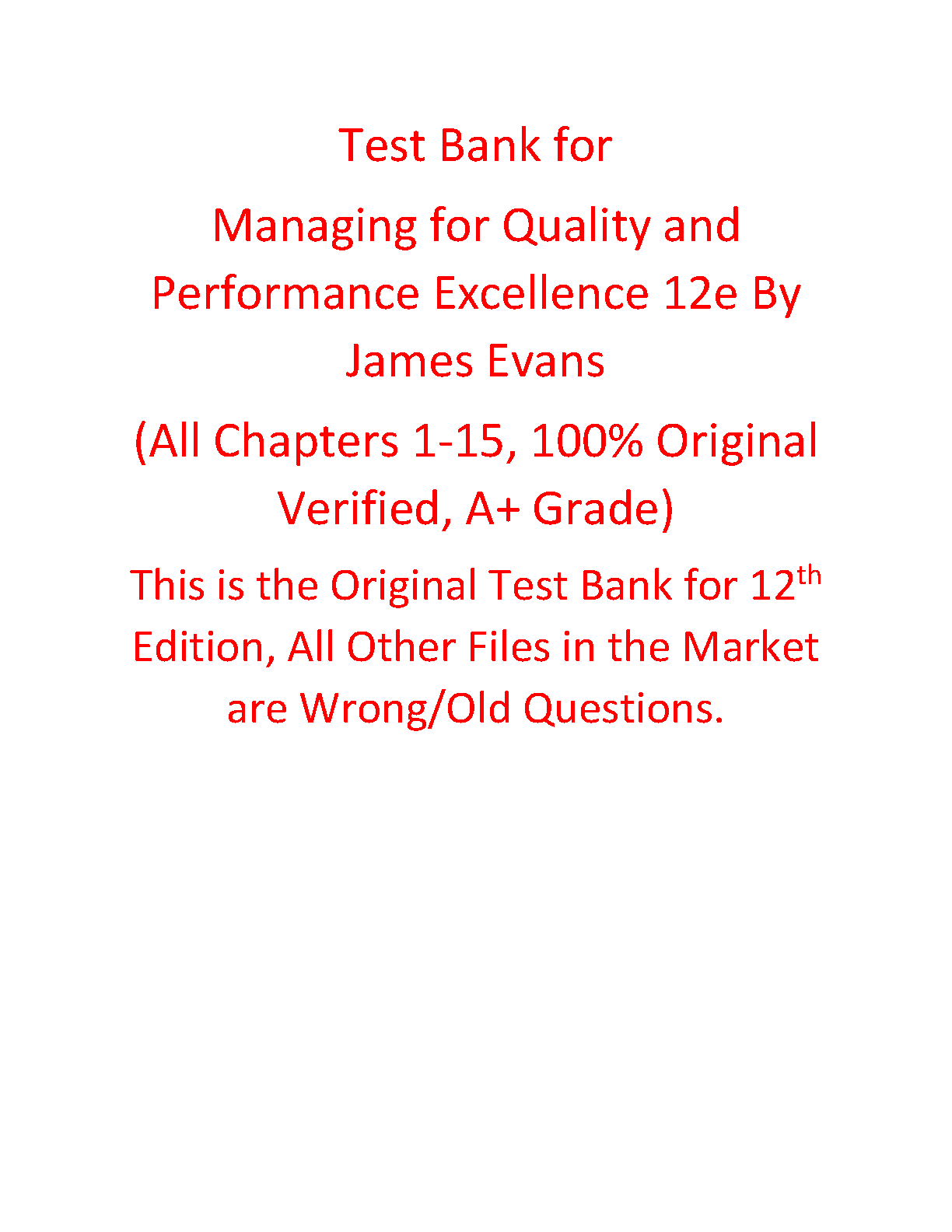 Test Bank for Managing for Quality and Performance Excellence 12e by James Evans - 2024/2025 Edition
