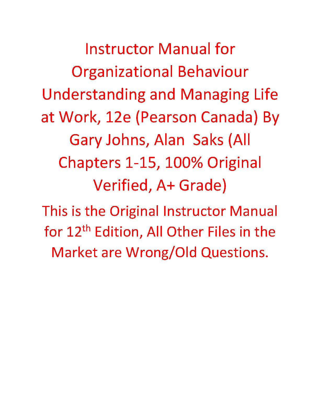 Ace your Organizational Behaviour course with this original instructor manual for the 12th edition by Gary Johns and Alan Saks. Covering all chapters (1-15), this verified A+ resource guarantees exam success on your first attempt, saving you time and stress. Unlike outdated materials, this is the genuine, updated version you need to excel.