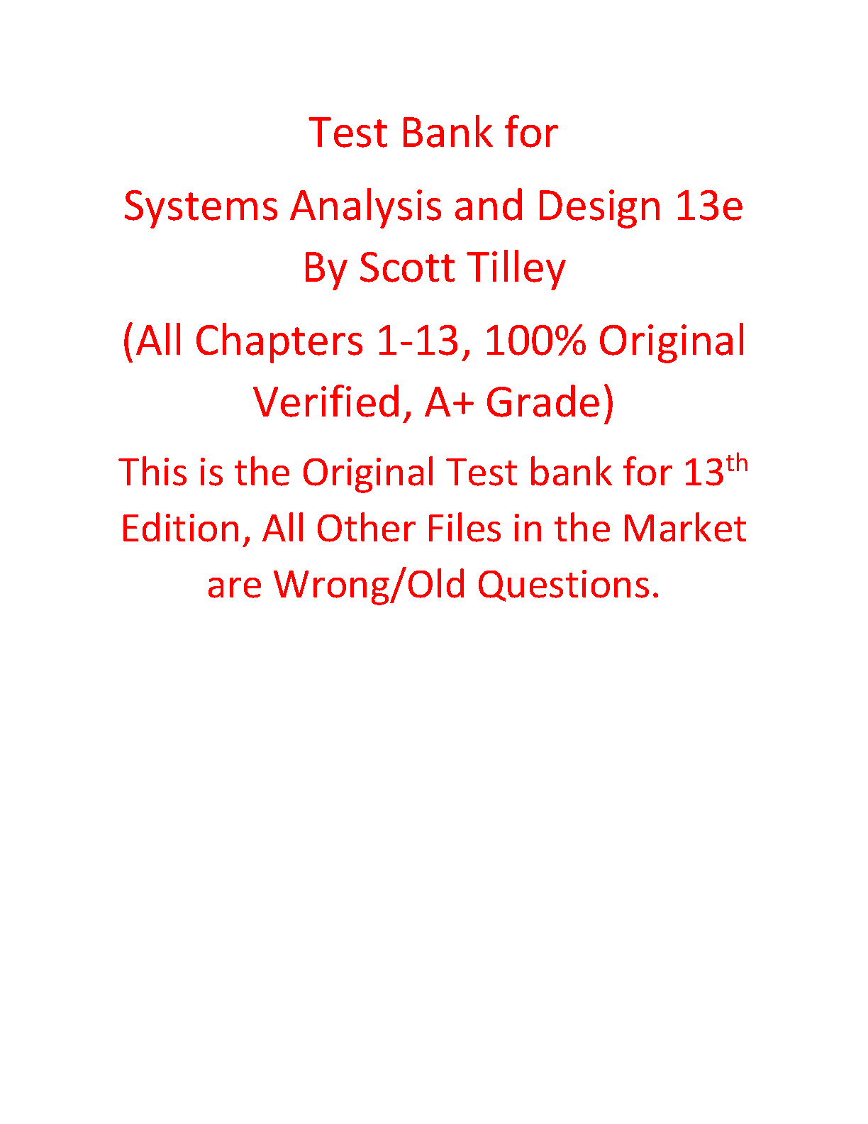 Ace your Systems Analysis and Design exams with this comprehensive 13th edition test bank by Scott Tilley. 100% original and verified questions covering all chapters (1-13) guarantee A+ results and help you avoid resits. This is the only authentic test bank available; others contain outdated or inaccurate questions.
