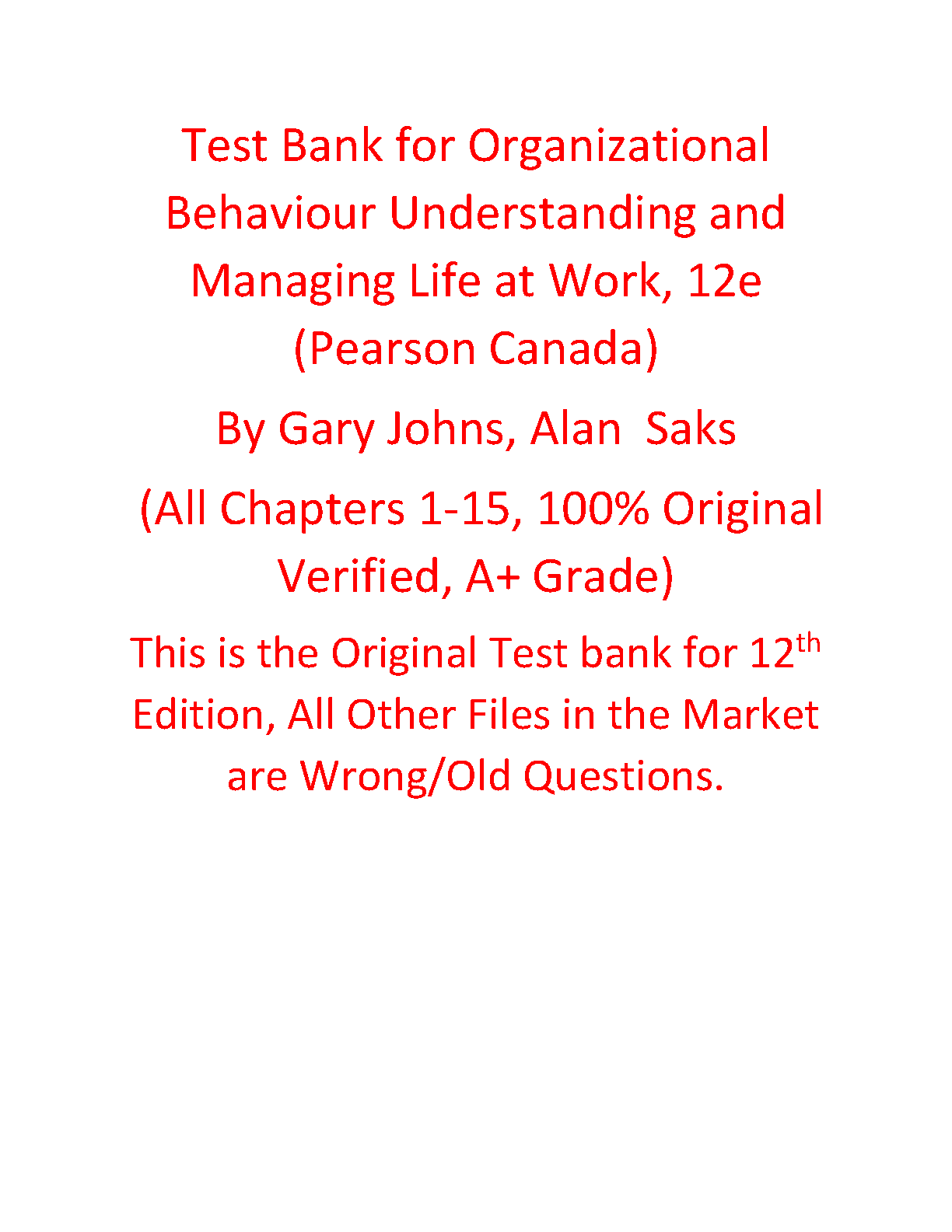 Ace your Organizational Behaviour exam with this 100% original and verified test bank for the 12th edition of "Organizational Behaviour: Understanding and Managing Life at Work" by Gary Johns and Alan Saks (Pearson Canada). This comprehensive resource covers all chapters (1-15) and guarantees an A+ grade. Avoid resits and pass on your first attempt!