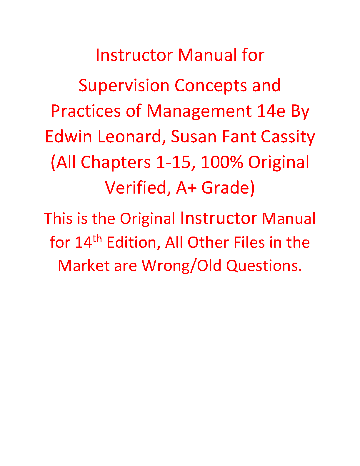 Ace your Management course with this original Instructor Manual for Supervision Concepts and Practices of Management, 14th Edition, by Edwin Leonard and Susan Fant Cassity. This verified, A+ grade resource covers all chapters (1-15) and ensures you're prepared for exam success on your first attempt, avoiding costly resits. This is the only 100% accurate and up-to-date manual available.