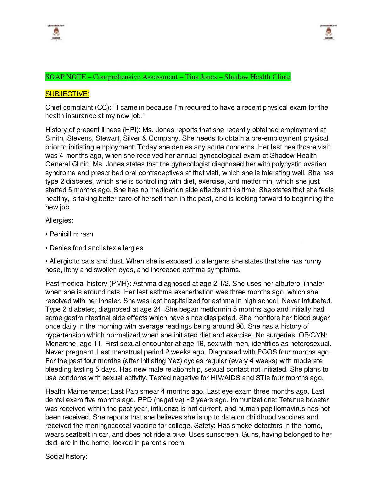 This detailed case study presents a comprehensive assessment of Tina Jones, a patient seeking a pre-employment physical. The case includes her medical history, allergies, social history, and health maintenance practices, providing valuable insights for healthcare students. Ideal for exam preparation and improving clinical reasoning skills.