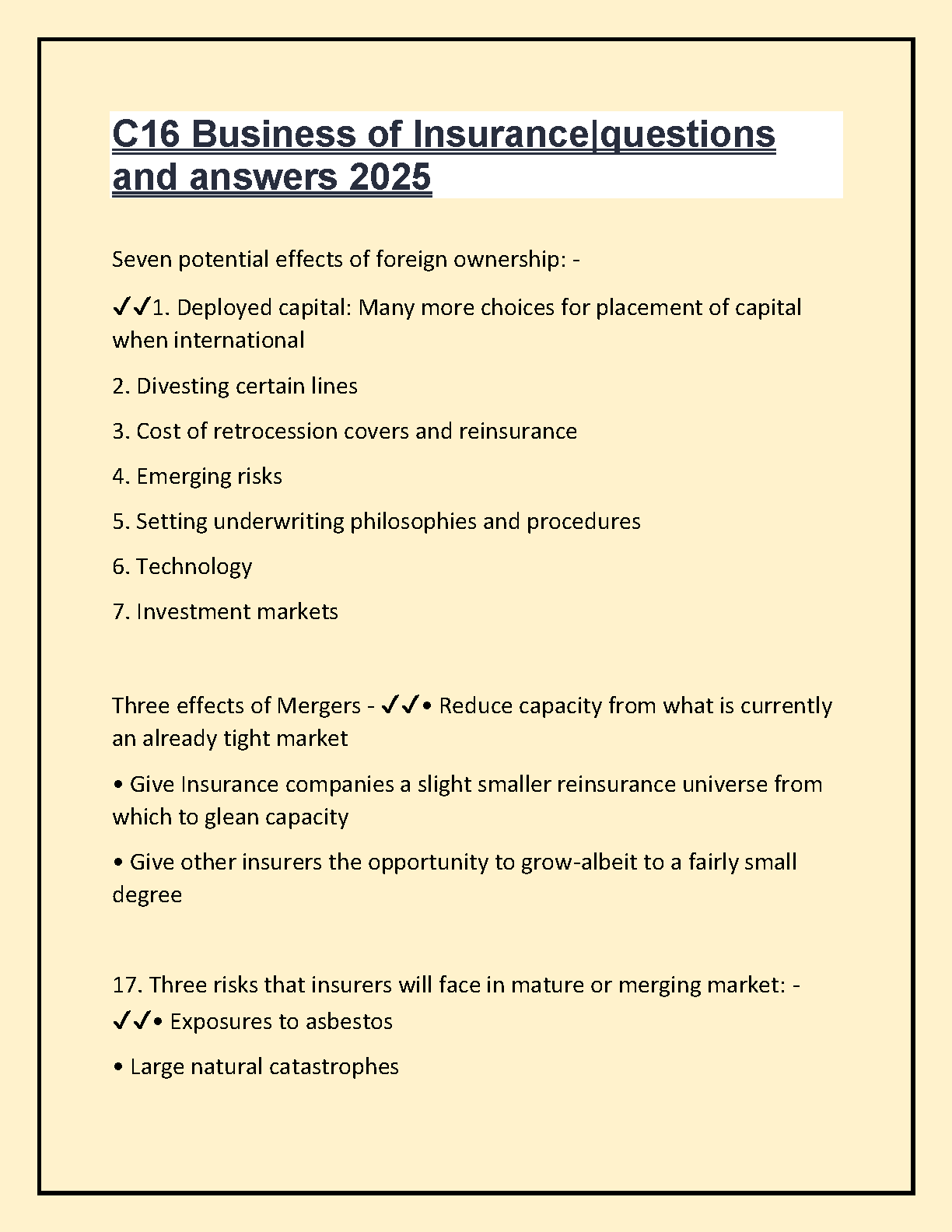 Ace your Business of Insurance exams with this comprehensive guide covering key concepts like foreign ownership effects, mergers, and emerging risks. Prepare for success and avoid resits with this 2024/2025 resource.