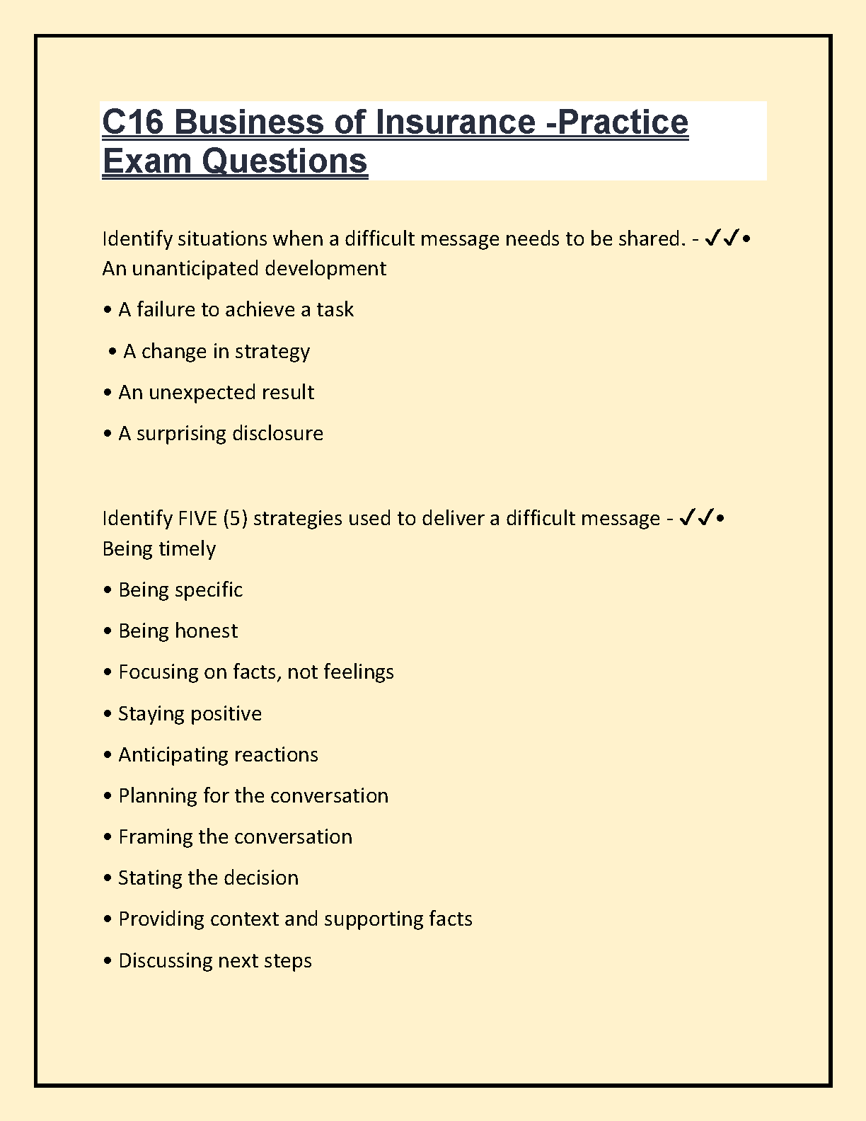 Master the complexities of insurance with this comprehensive study guide designed to help you pass your C16 Business of Insurance exam on the first try. This resource covers key concepts and strategies for handling difficult messages, ensuring exam readiness and success. Get ahead of the curve for the 2024-2025 academic year!