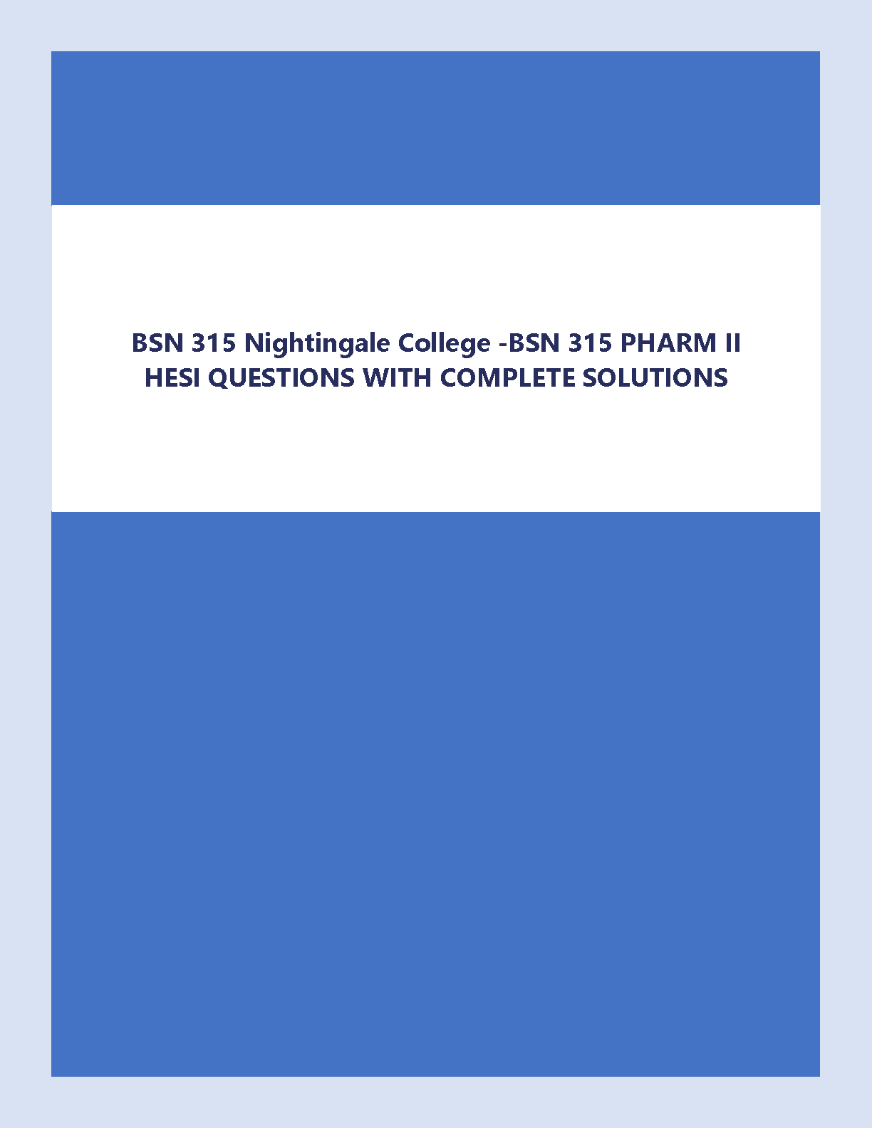 Ace your BSN 315 Pharmacology II HESI exam at Nightingale College with this comprehensive study guide. This resource includes practice questions with detailed solutions, covering all key concepts to help you succeed on your first attempt and avoid resits. Perfect for students aiming for high scores and exam mastery.