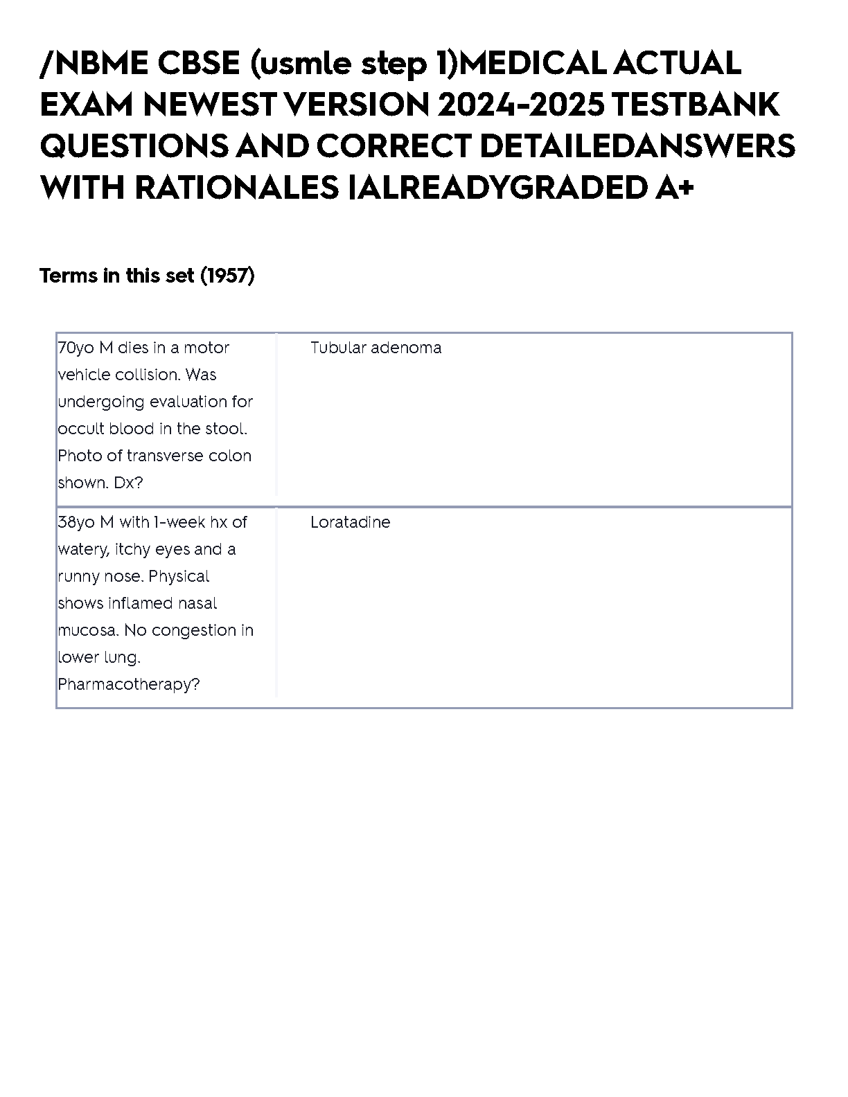 Ace your USMLE Step 1 exam with this comprehensive 2024-2025 NBME CBSE test bank. This resource includes detailed answers with rationales to help you understand the concepts thoroughly and achieve a high score. Avoid resits and pass on your first attempt!