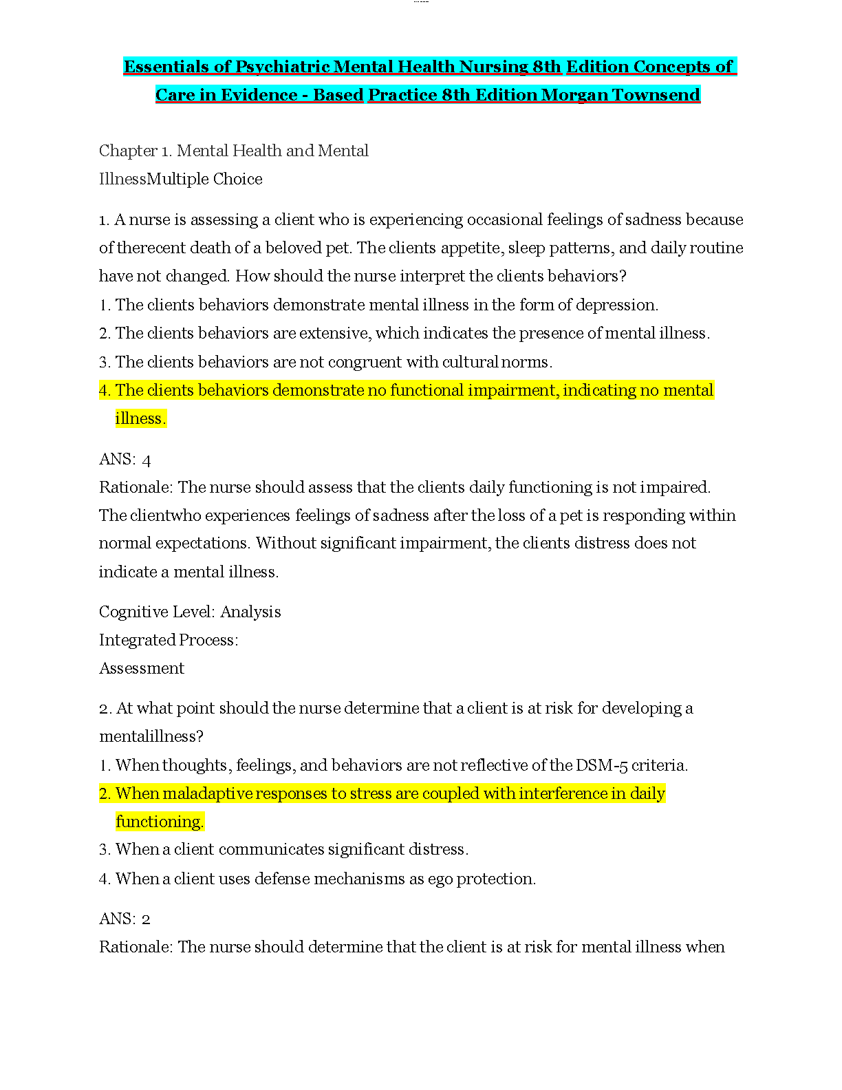 Ace your exams with this comprehensive test bank for Essentials of Psychiatric Mental Health Nursing, 8th Edition and Concepts of Care in Evidence-Based Practice, 8th Edition by Morgan Townsend and Mary Townsend. This resource provides in-depth practice questions that cover all essential topics and concepts. Prepare effectively and avoid exam resits.