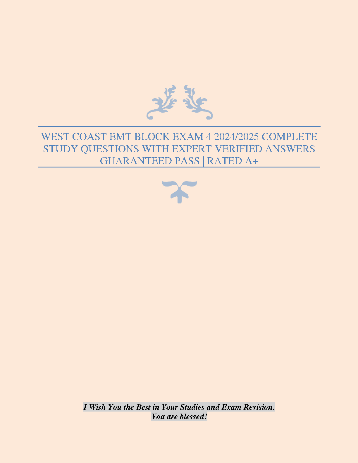 Ace your West Coast EMT Block Exam 4 (2024/2025) with this comprehensive study guide featuring expert-verified answers. Designed to guarantee a pass, this resou...