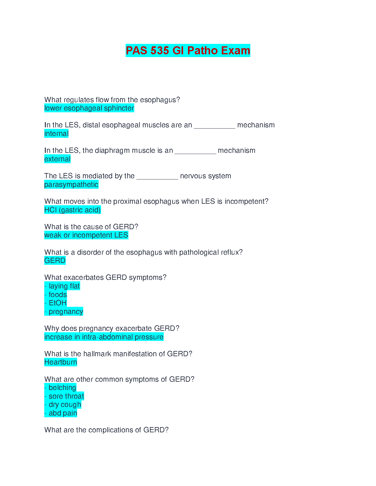 Ace your PAS 535 GI Patho Exam with this comprehensive study guide designed for students aiming to pass on their first attempt. This resource covers key concepts related to the lower esophageal sphincter (LES), GERD, and more, helping you avoid resits and master the material. Perfect for the 2024-2025 academic year.