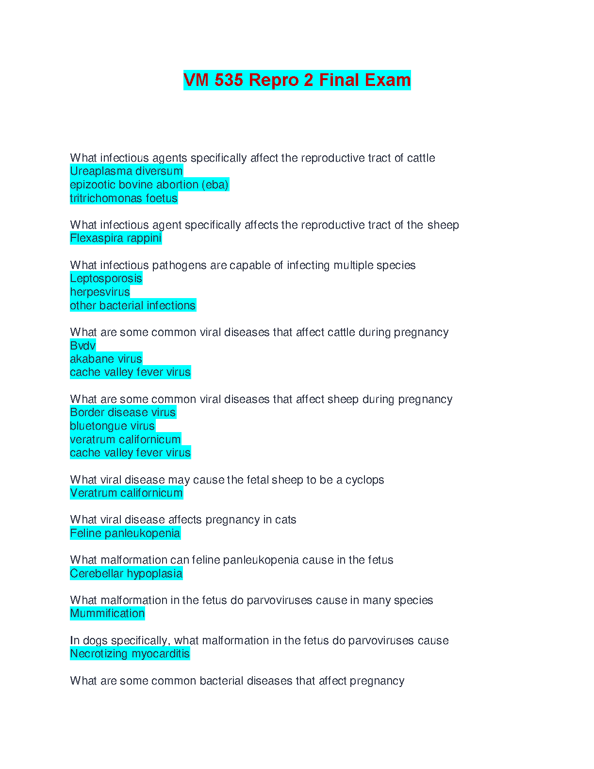 This comprehensive study guide for VM 535 Repro 2 Final Exam is designed to help veterinary students master the key concepts and excel in their exams. This updated 2024-2025 edition covers all the essential topics, including infectious agents affecting cattle and sheep reproductive tracts, viral diseases during pregnancy in different species, and fetal malformations. Pass your exam on the first attempt and avoid resits!